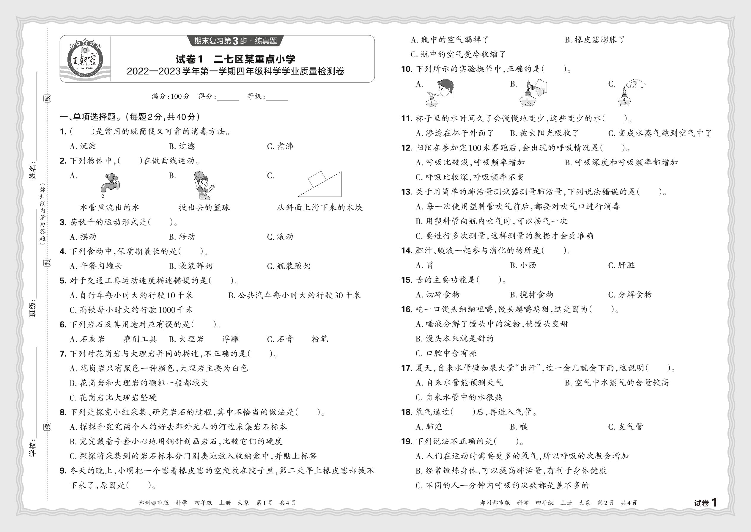 河南省郑州市二七区某重点小学2022—2023学年第一学期四年级科学学业质量检测卷(大象版)【1】