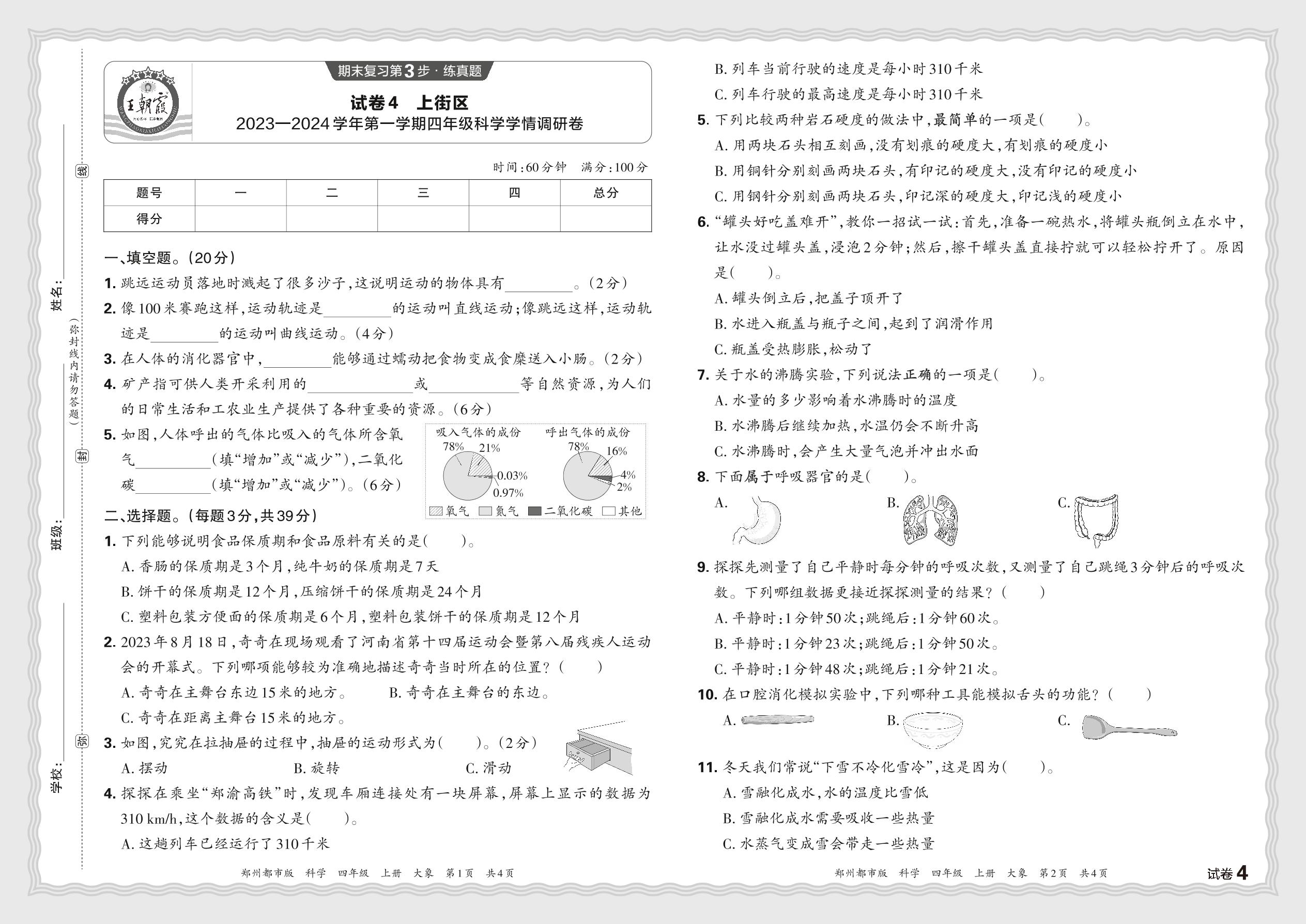 河南省郑州市上街区2023—2024学年第一学期四年级科学学期调研卷(大象版)【4】
