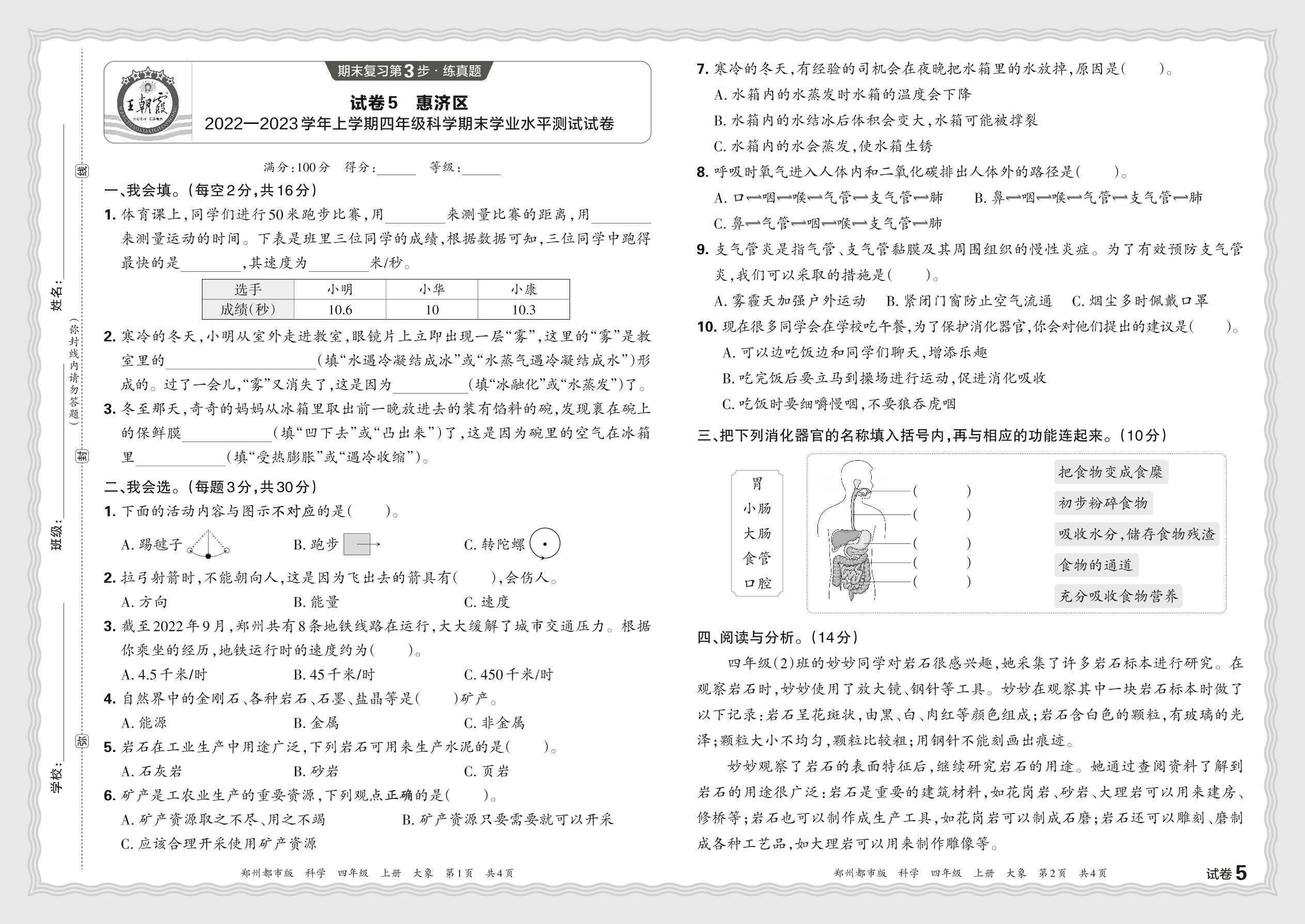 河南省郑州市惠济区2022—2023学年上学期四年级科学期末学业水平测试(大象版)【5】