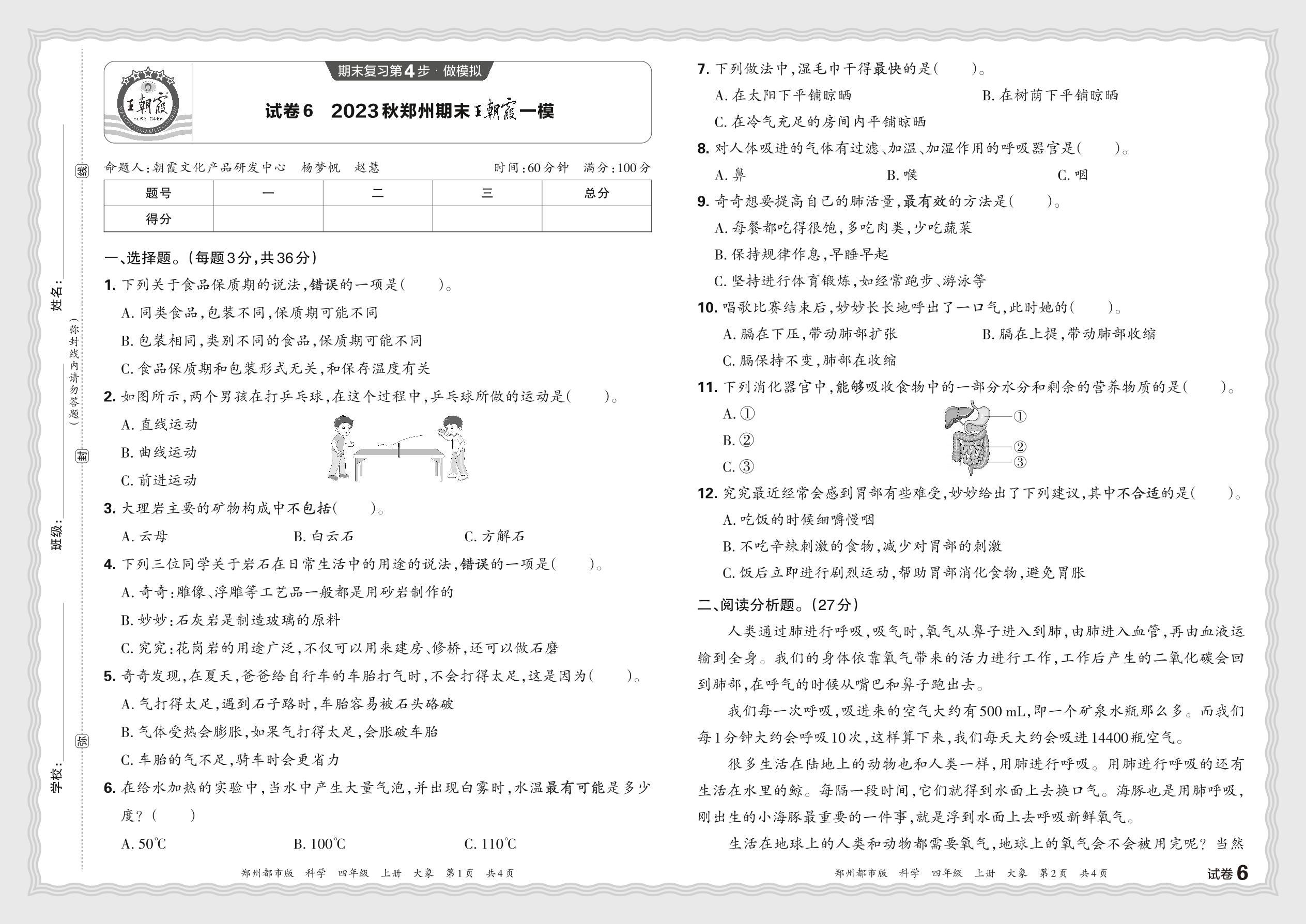 2023秋上册四年级科学大象版 河南郑州期末王朝霞一模【6】