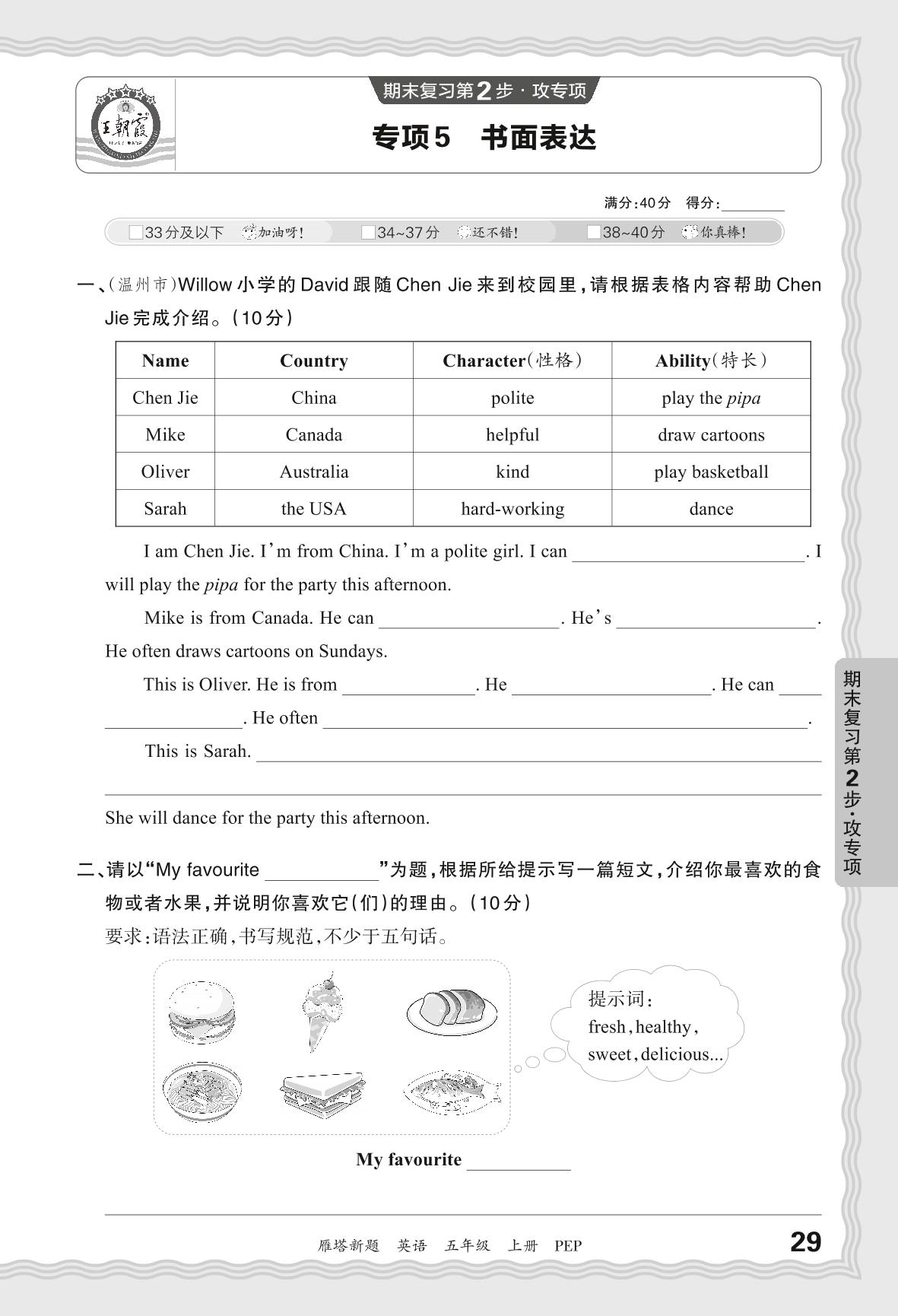 2023秋上册五年级英语人教PEP版 期末专项·书面表达【5】