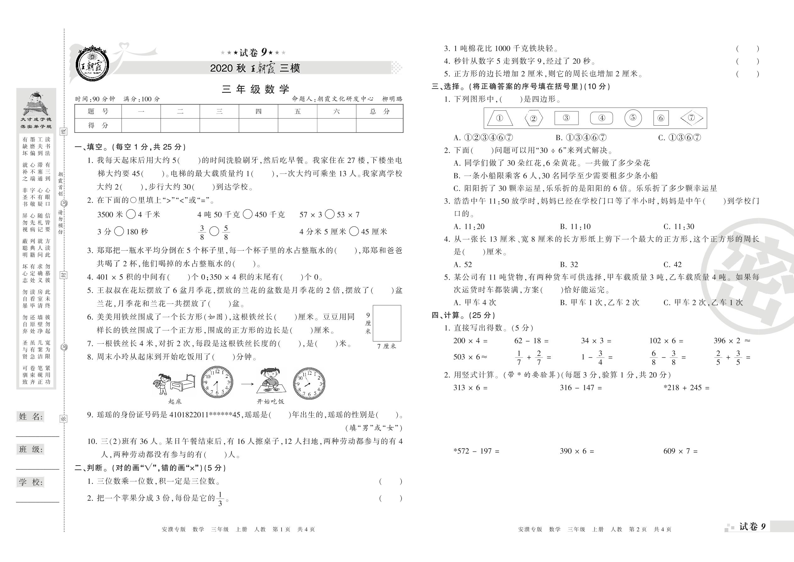王朝霞期末模拟卷三年级上册数学(人教版)_R21080491206【9】