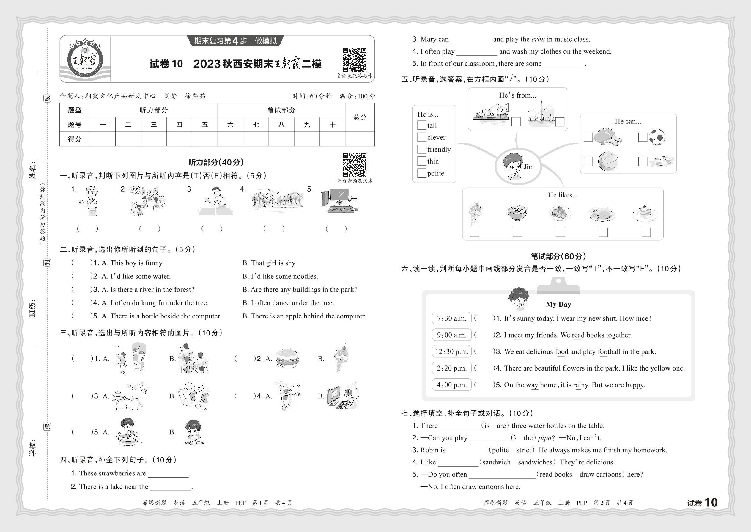 2023秋上册五年级英语人教PEP版 陕西西安期末王朝霞二模