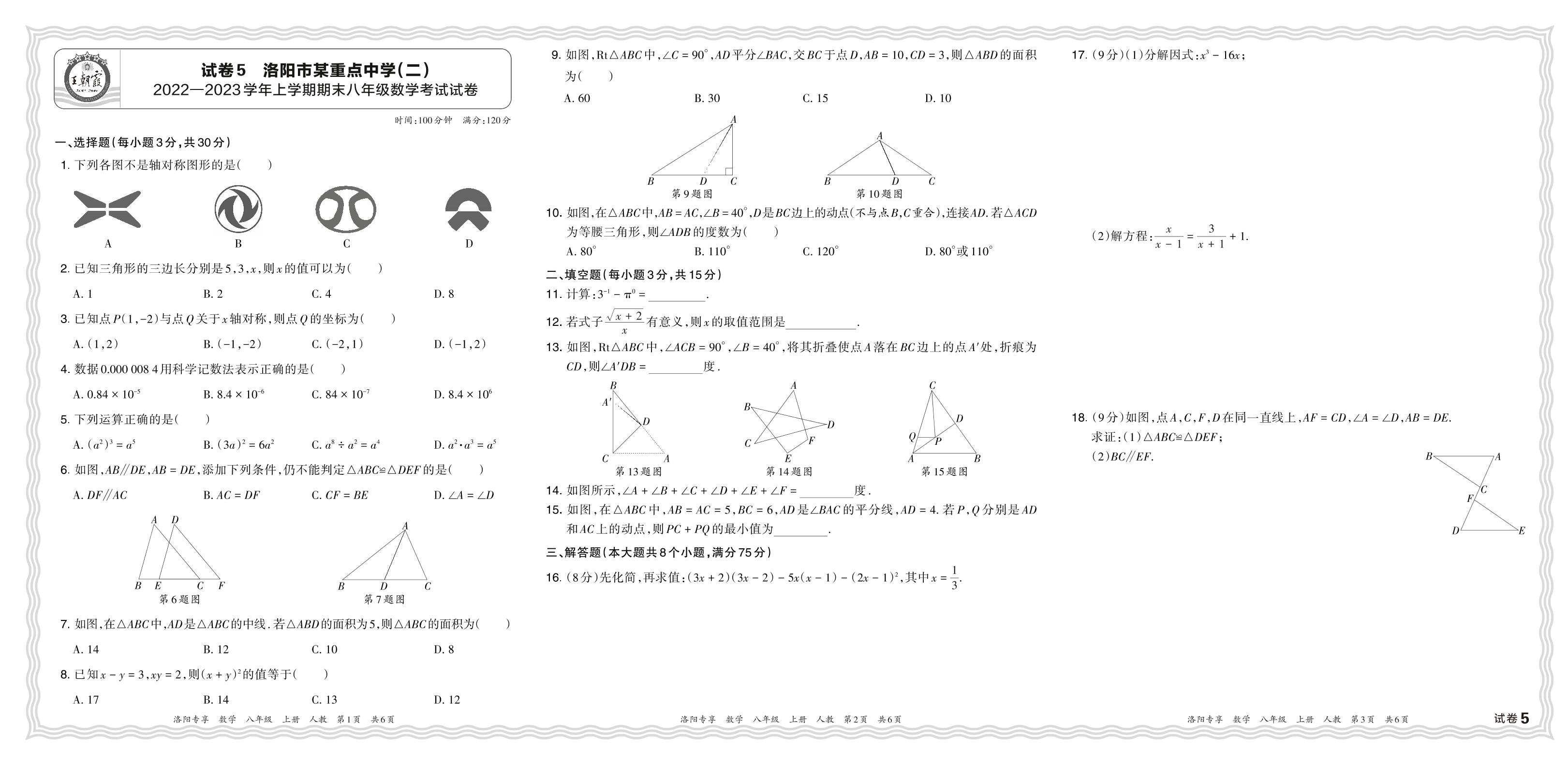 河南省洛阳市某重点中学(二)2022—2023学年上学期期末八年级数学质量检测试卷(人教版)【5】