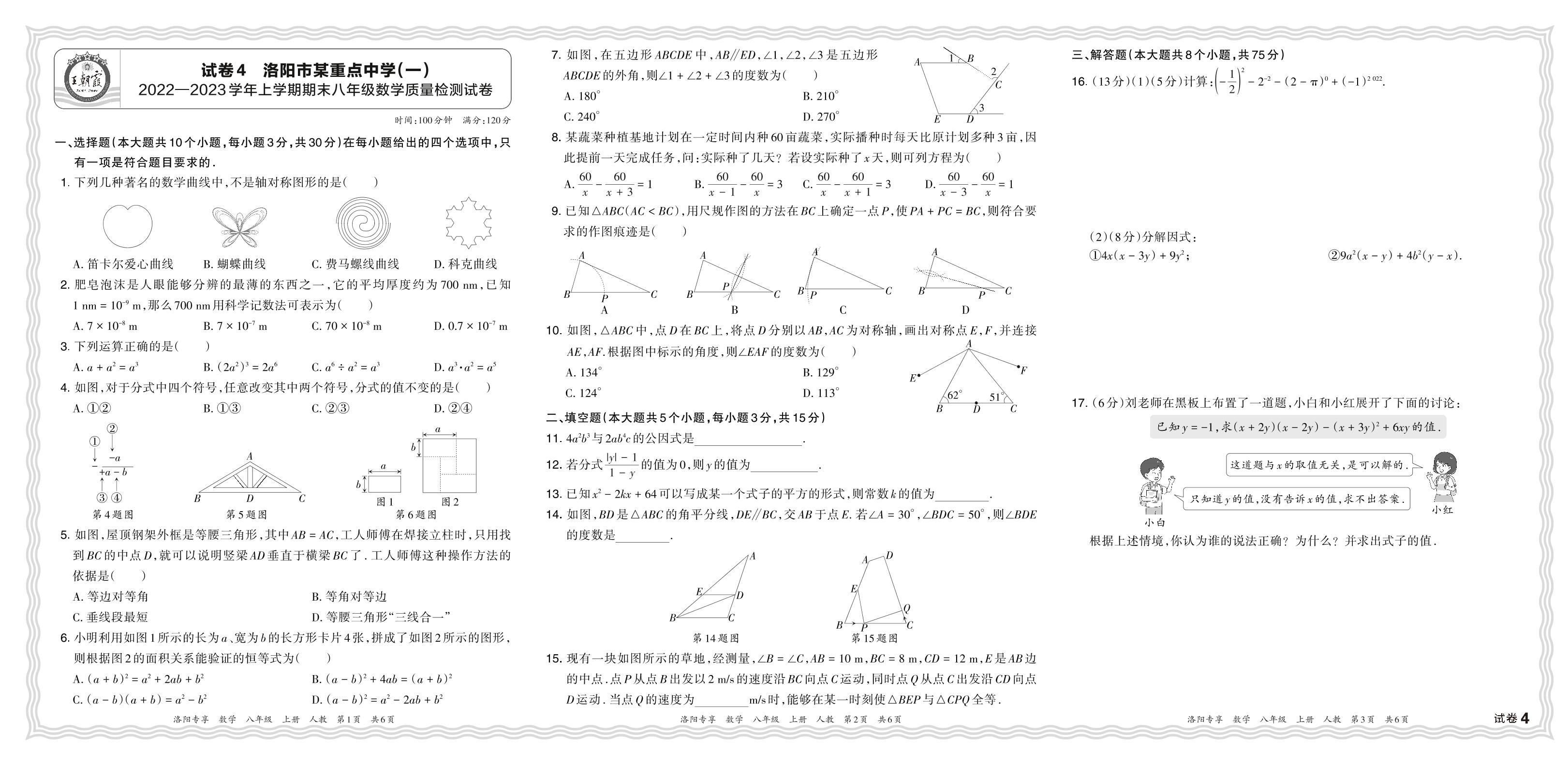 河南省洛阳市某重点中学(一)2022—2023学年上学期期末八年级数学质量检测试卷(人教版)【4】