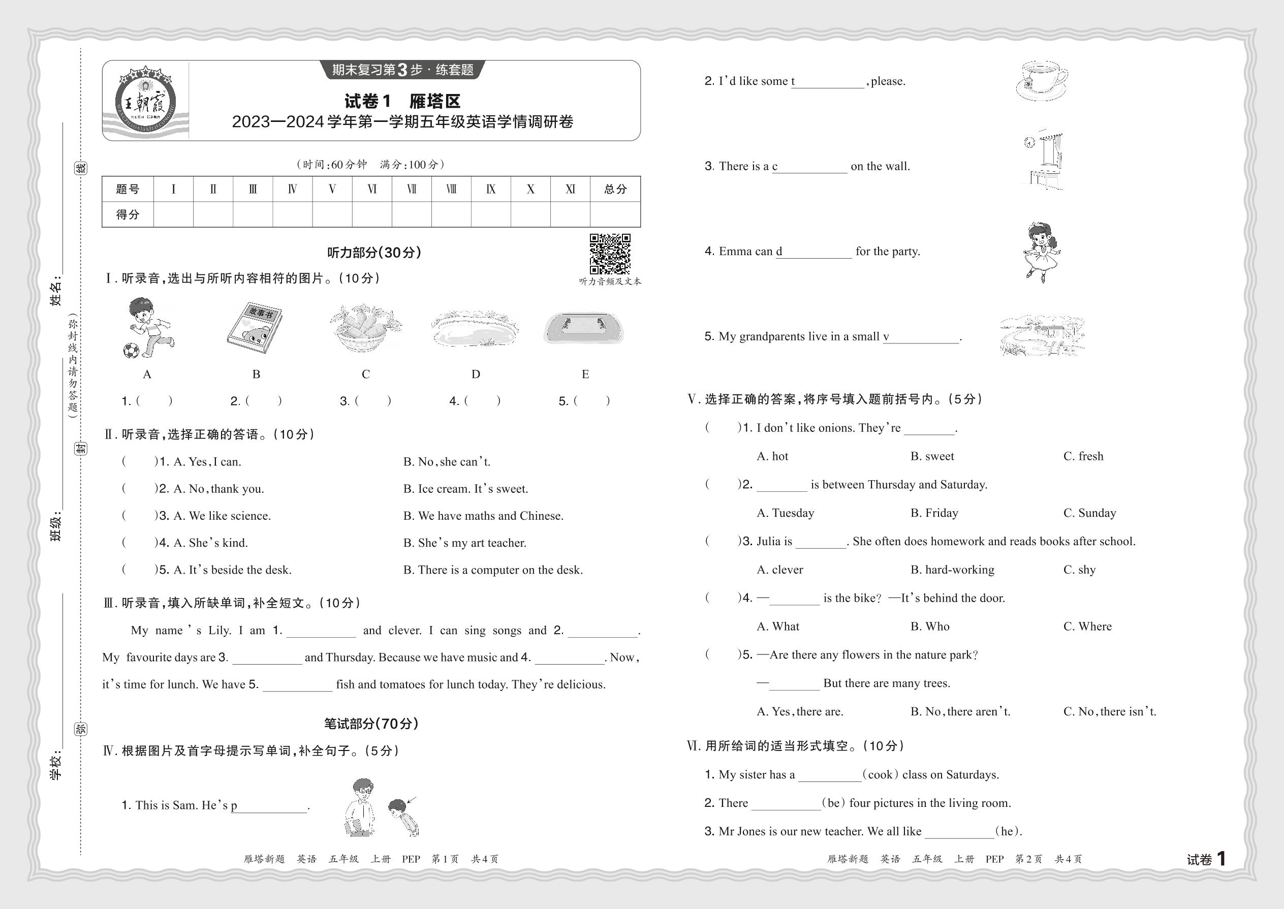 陕西省西安市雁塔区2023—2024学年第一学期五年级英语学情调研卷(PEP版)【1】