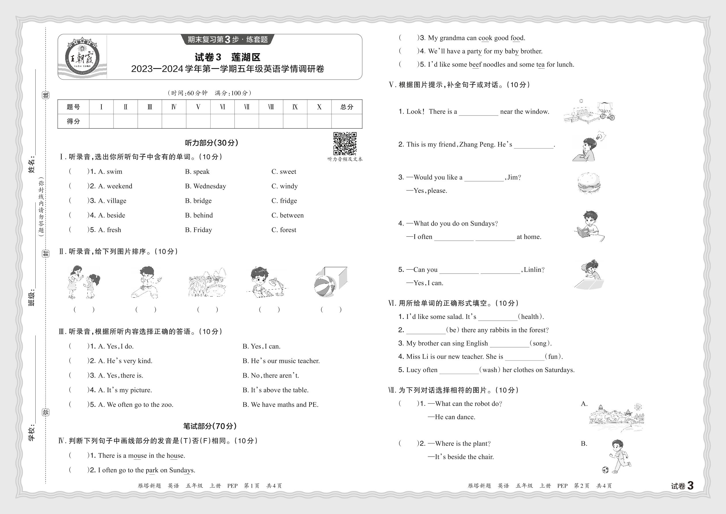 陕西省西安市莲湖区2023—2024学年第一学期五年级英语学情调研卷(PEP版)【3】