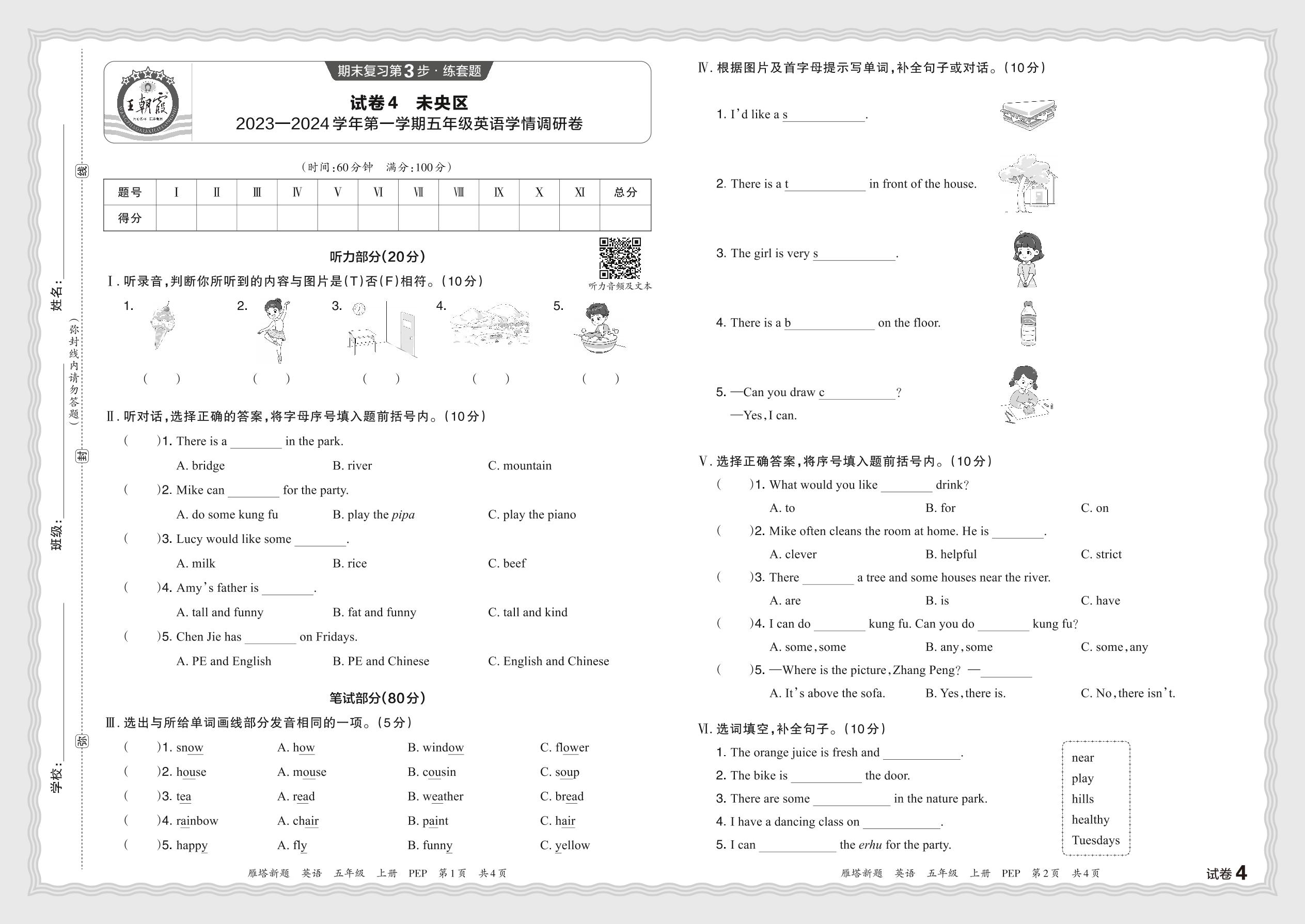 陕西省西安市未央区2023—2024学年第一学期五年级英语学情调研卷(PEP版)【4】