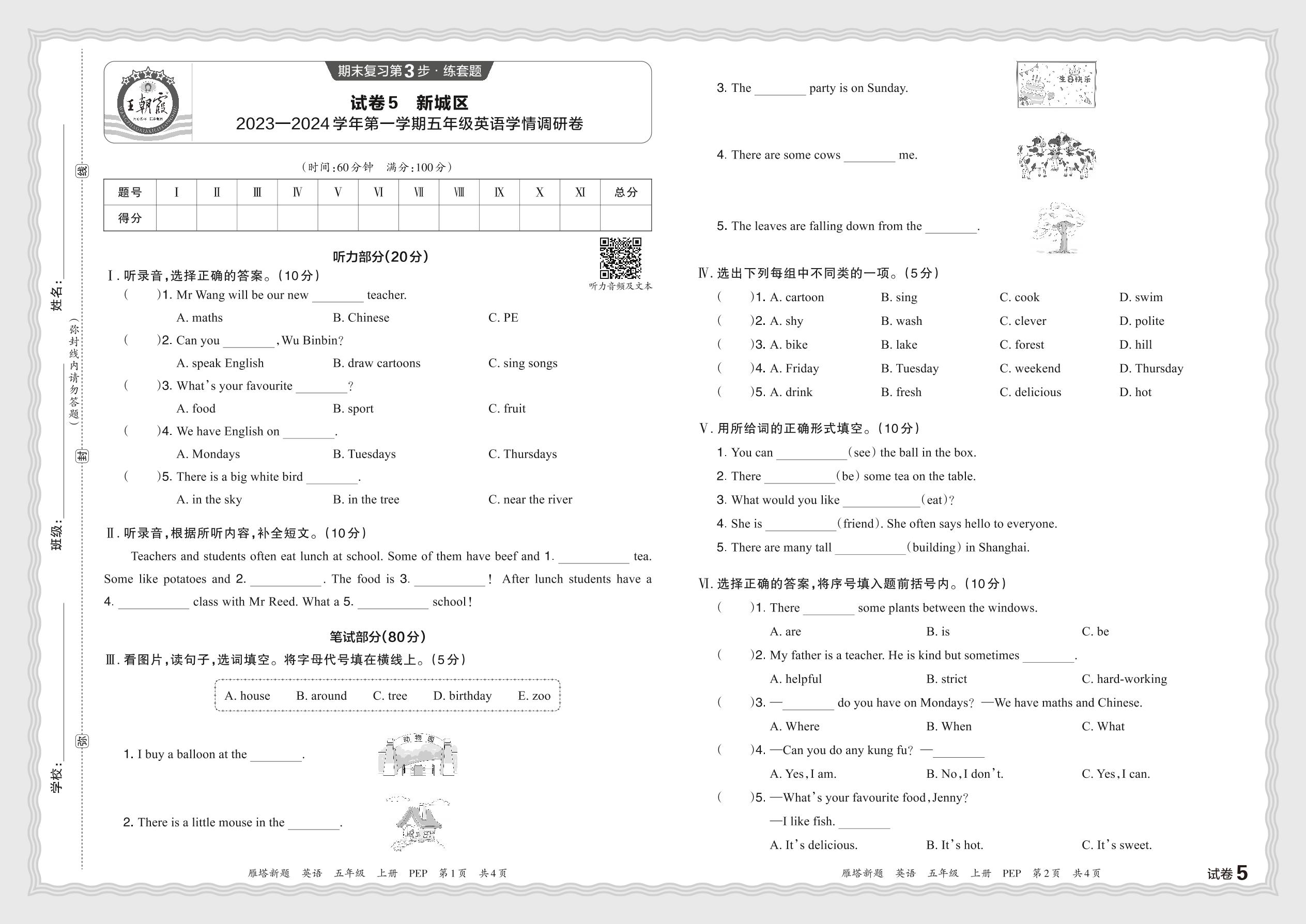 陕西省西安市新城区2023—2024学年第一学期五年级英语学情调研卷(PEP版)【5】