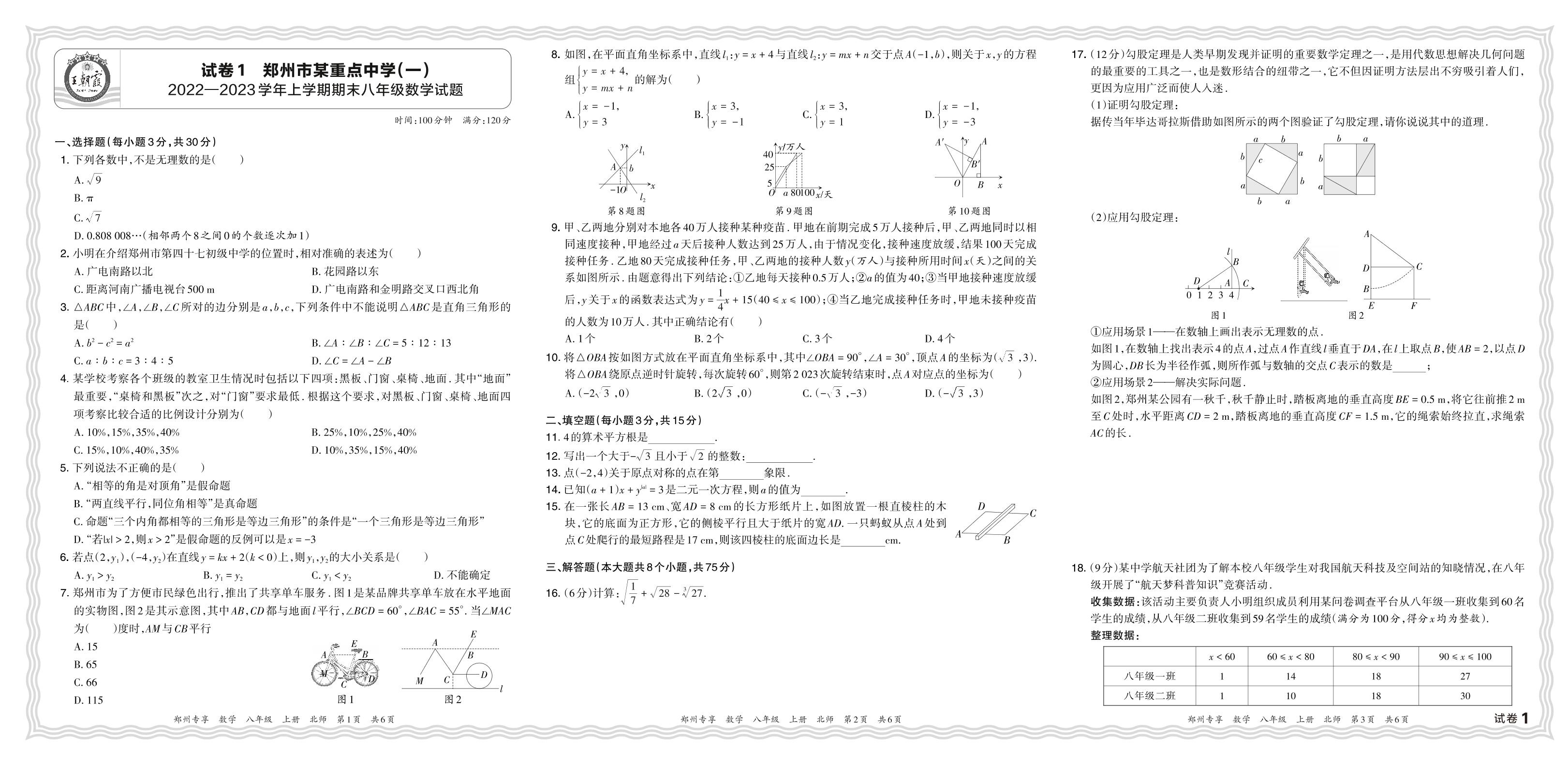 河南省郑州市某重点中学(一)2022—2023学年上学期期末八年级数学试题(北师版)【1】