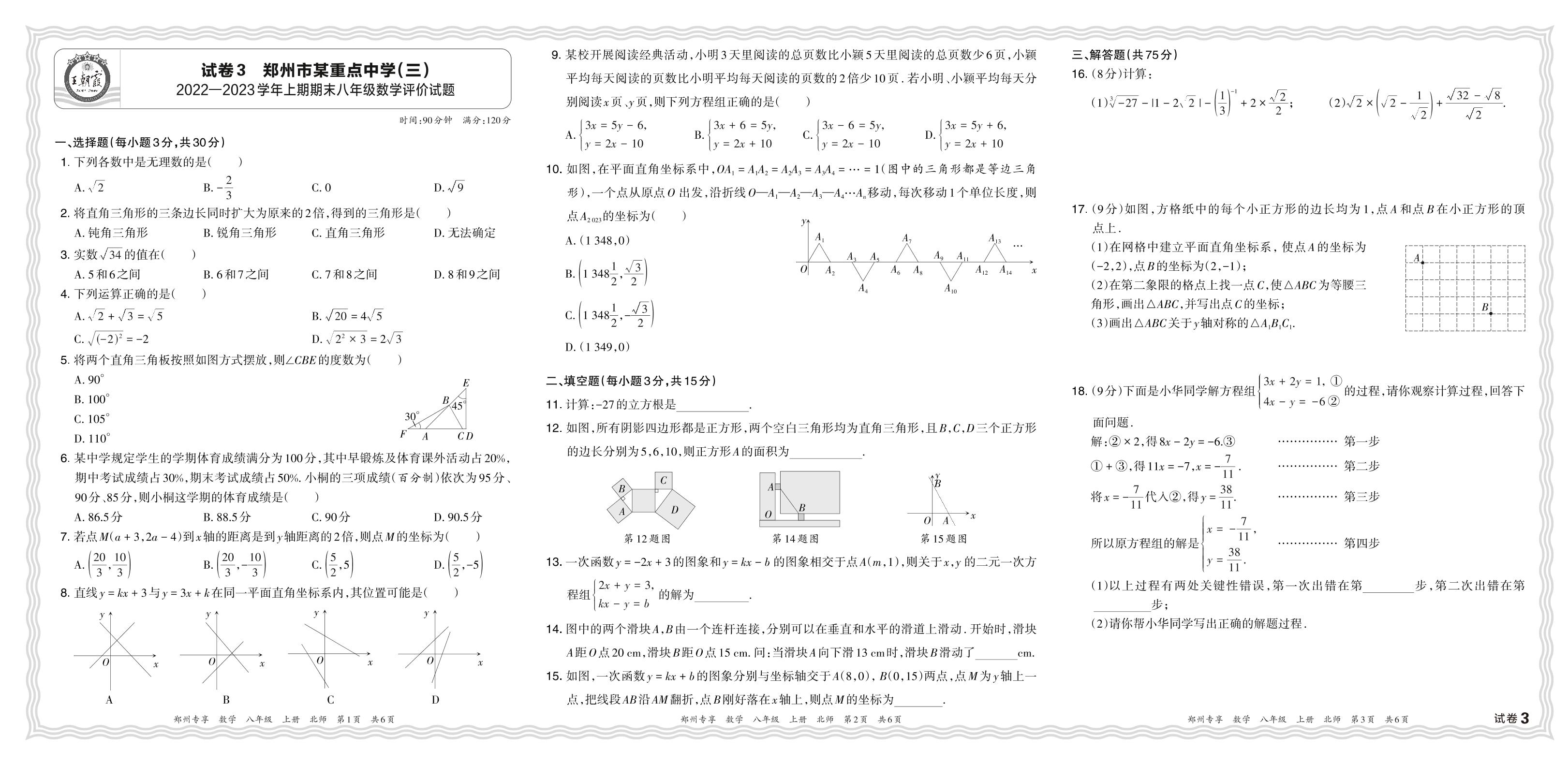 河南省郑州市某重点中学(三)2022—2023学年上期期末八年级数学评价试题(北师版)【3】