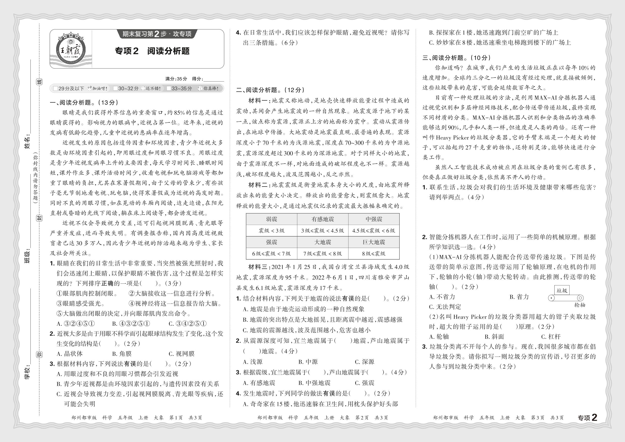 2023秋上册五年级科学大象版 期末专项卷·阅读分析题【2】