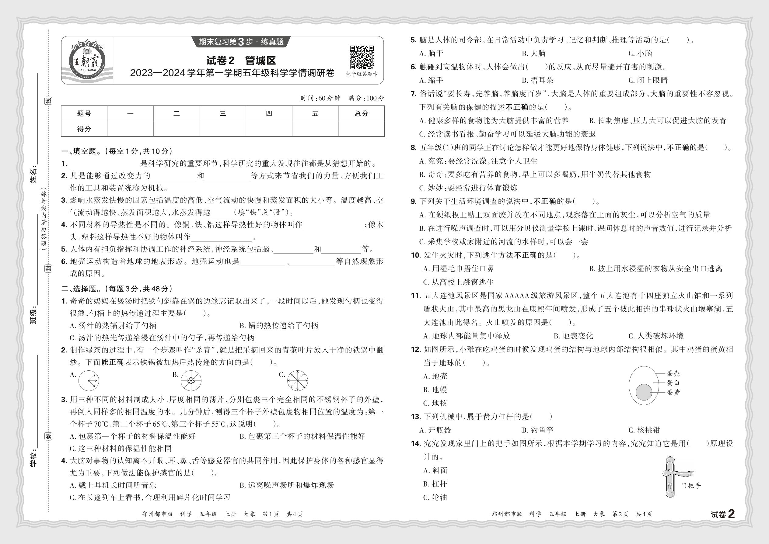 河南省郑州市管城区2023—2024学年第一学期五年级科学学期调研卷(大象版)【2】