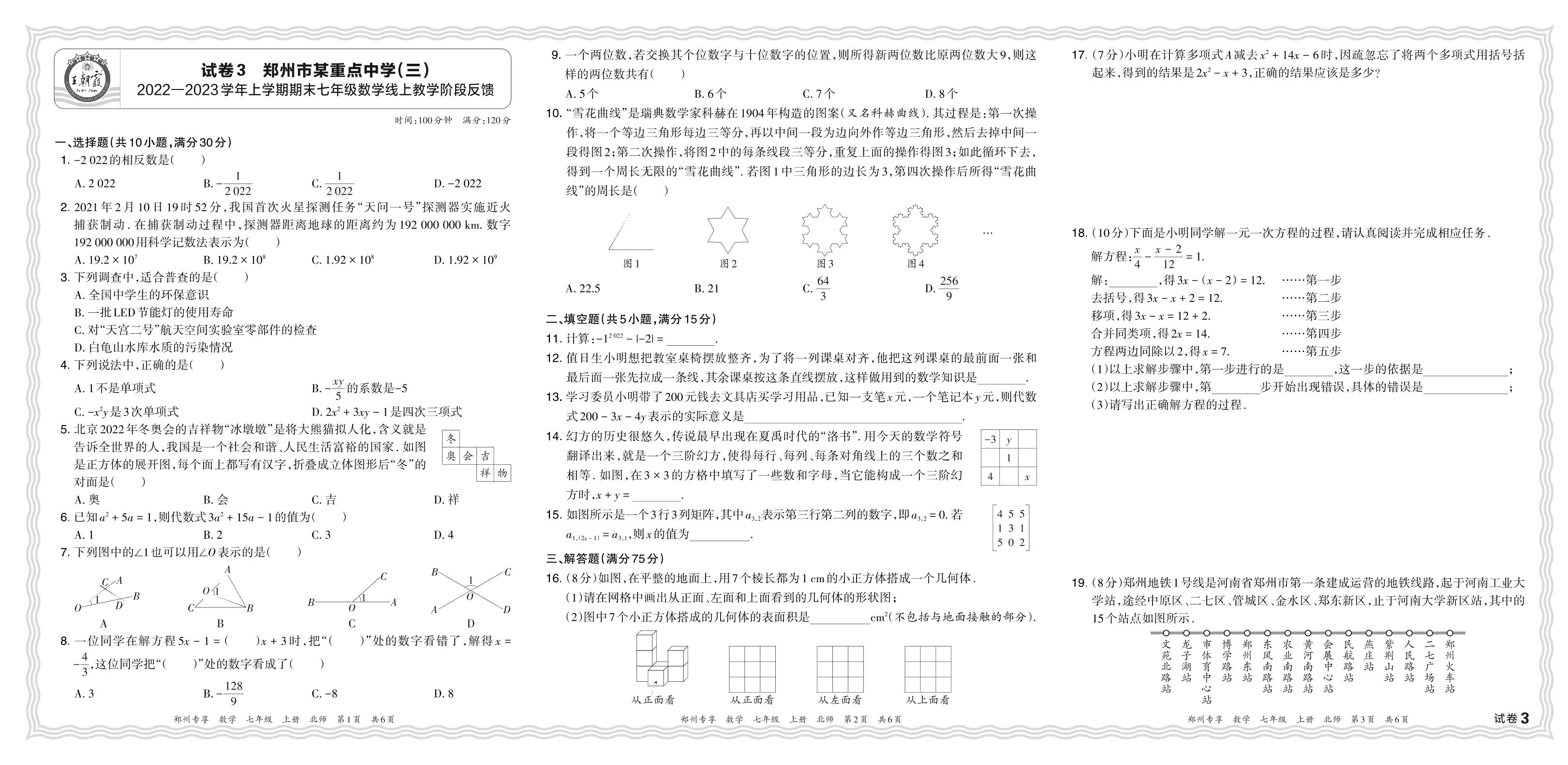 河南省郑州市某重点中学(三)2022—2023学年上学期期末七年级数学线上教学阶段反馈(北师版)【3】
