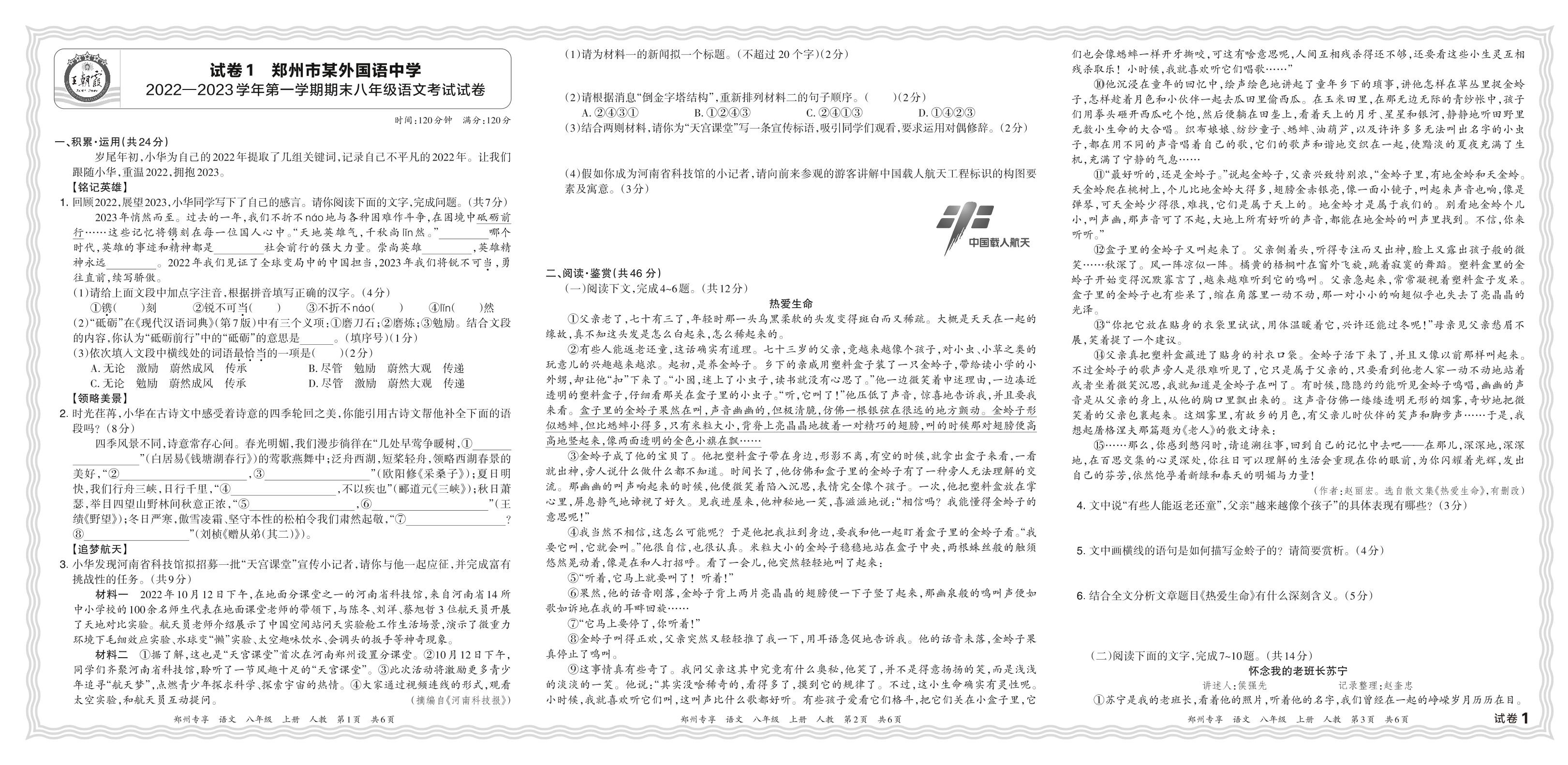 河南省郑州市某外国语中学2022—2023学年第一学期期末八年级语文考试试卷(人教版)【1】