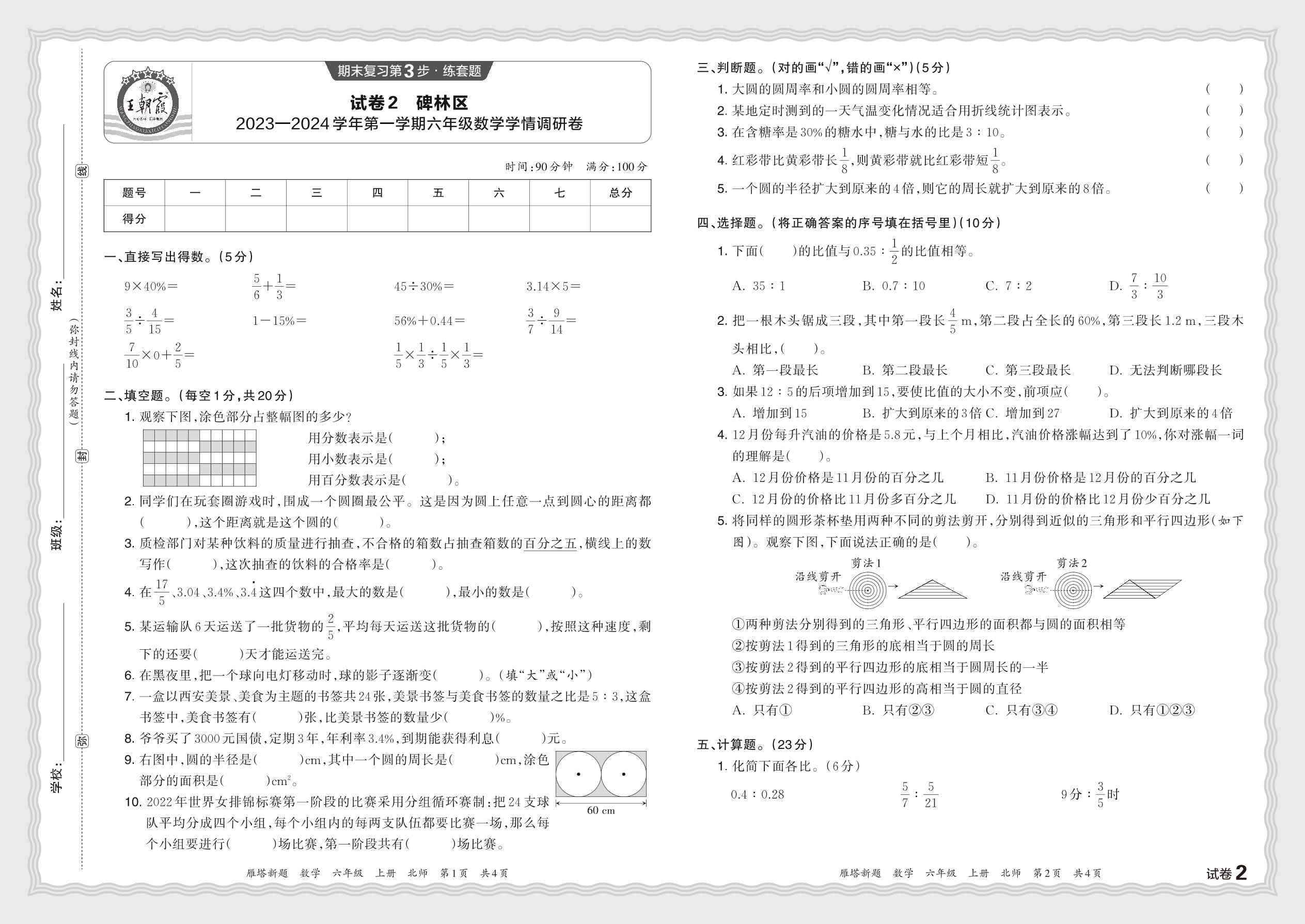 陕西省西安市碑林区2023—2024学年第一学期六年级数学学情调研卷(北师版)【2】