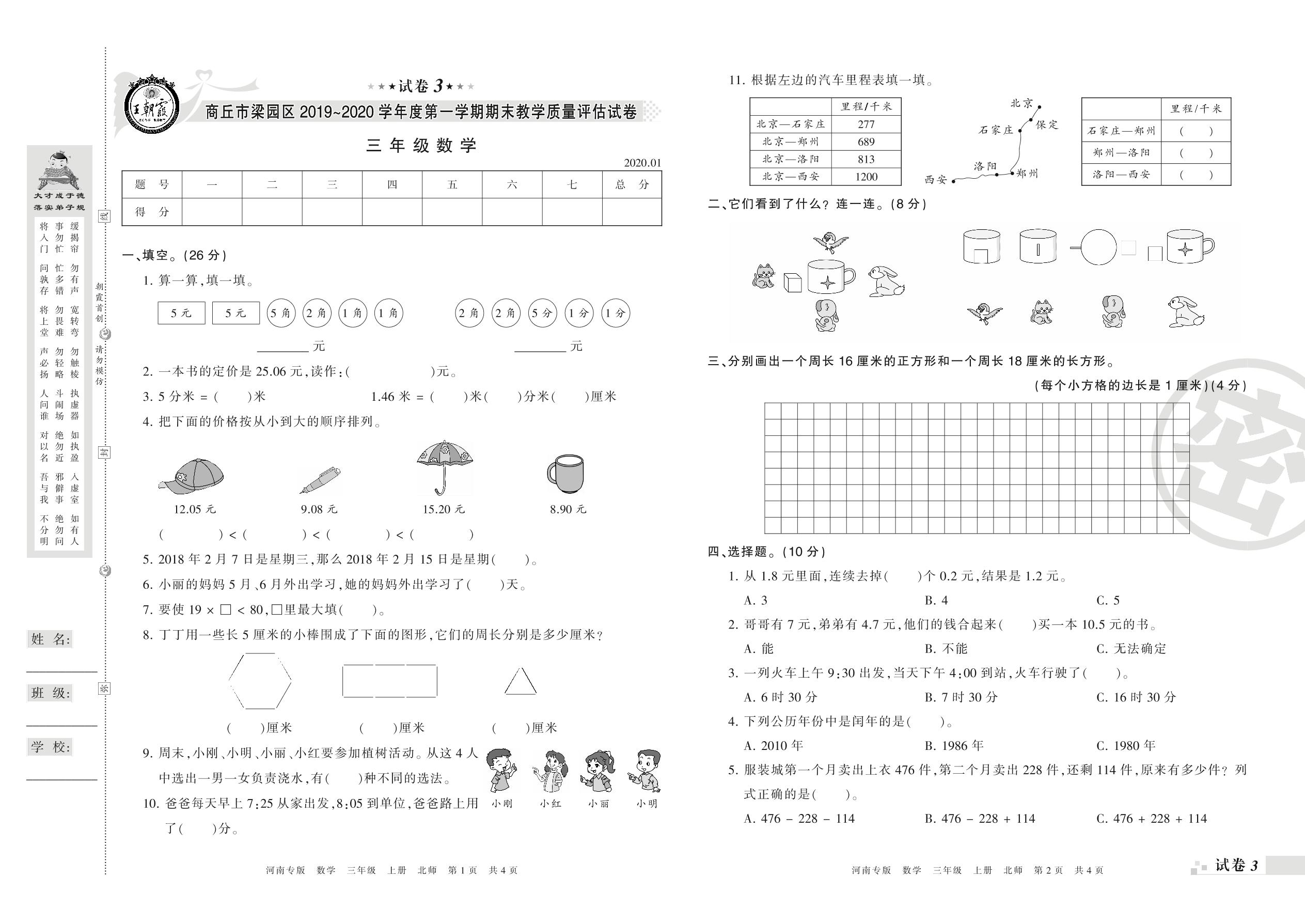 2019-2020学年第一学期商丘市梁园区三年级数学试卷(北师版)【3】