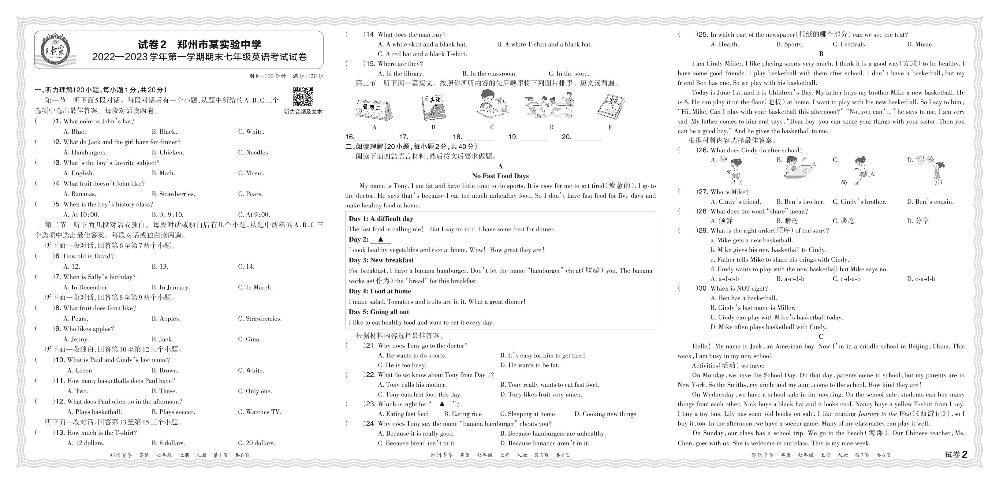河南省郑州市某实验中学2022一2023学年第一学期期末七年级英语考试试卷(人教版)【2】