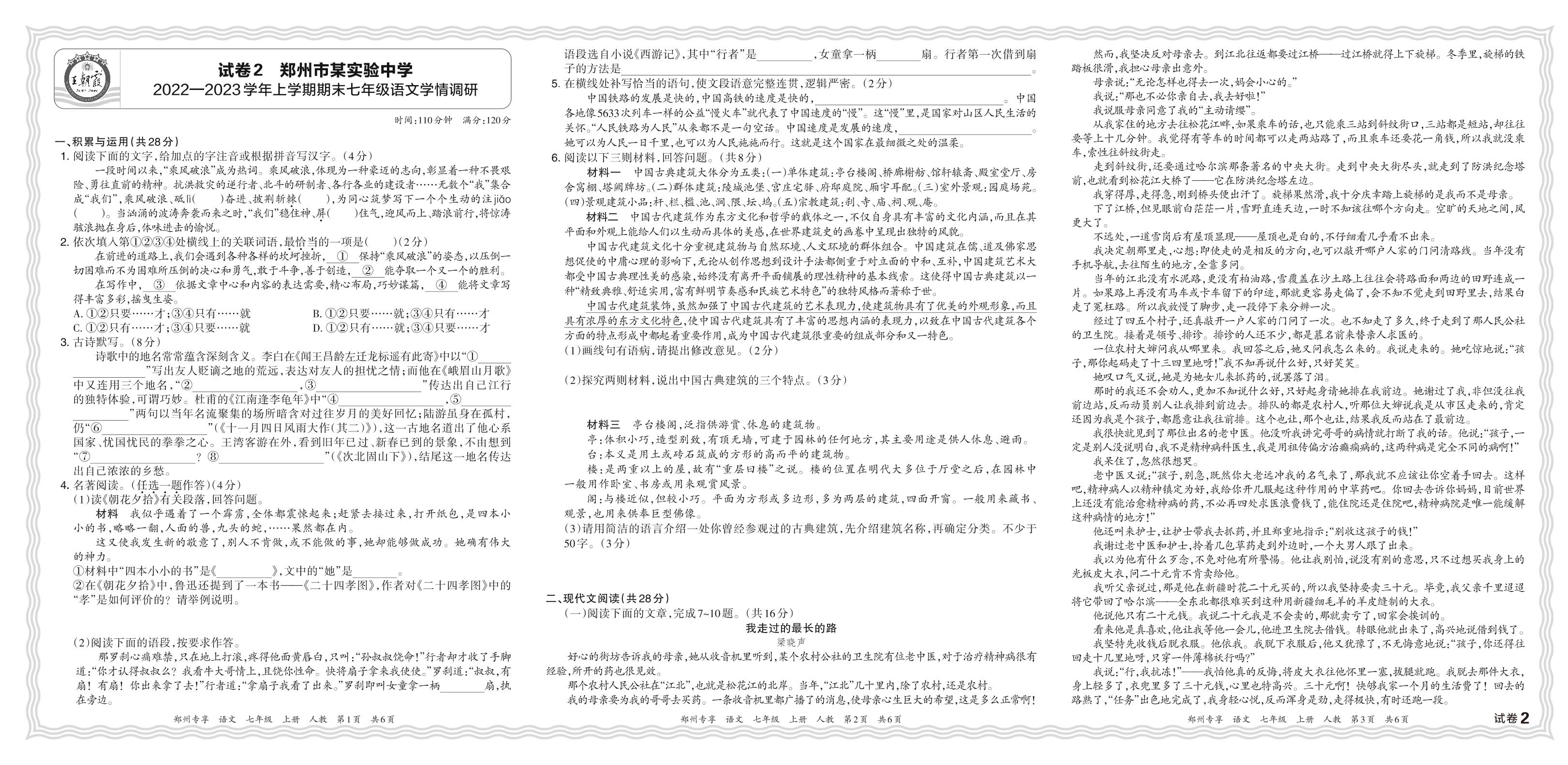 河南省郑州市某实验中学2022—2023学年上学期期末七年级语文学情调研(人教版)【2】