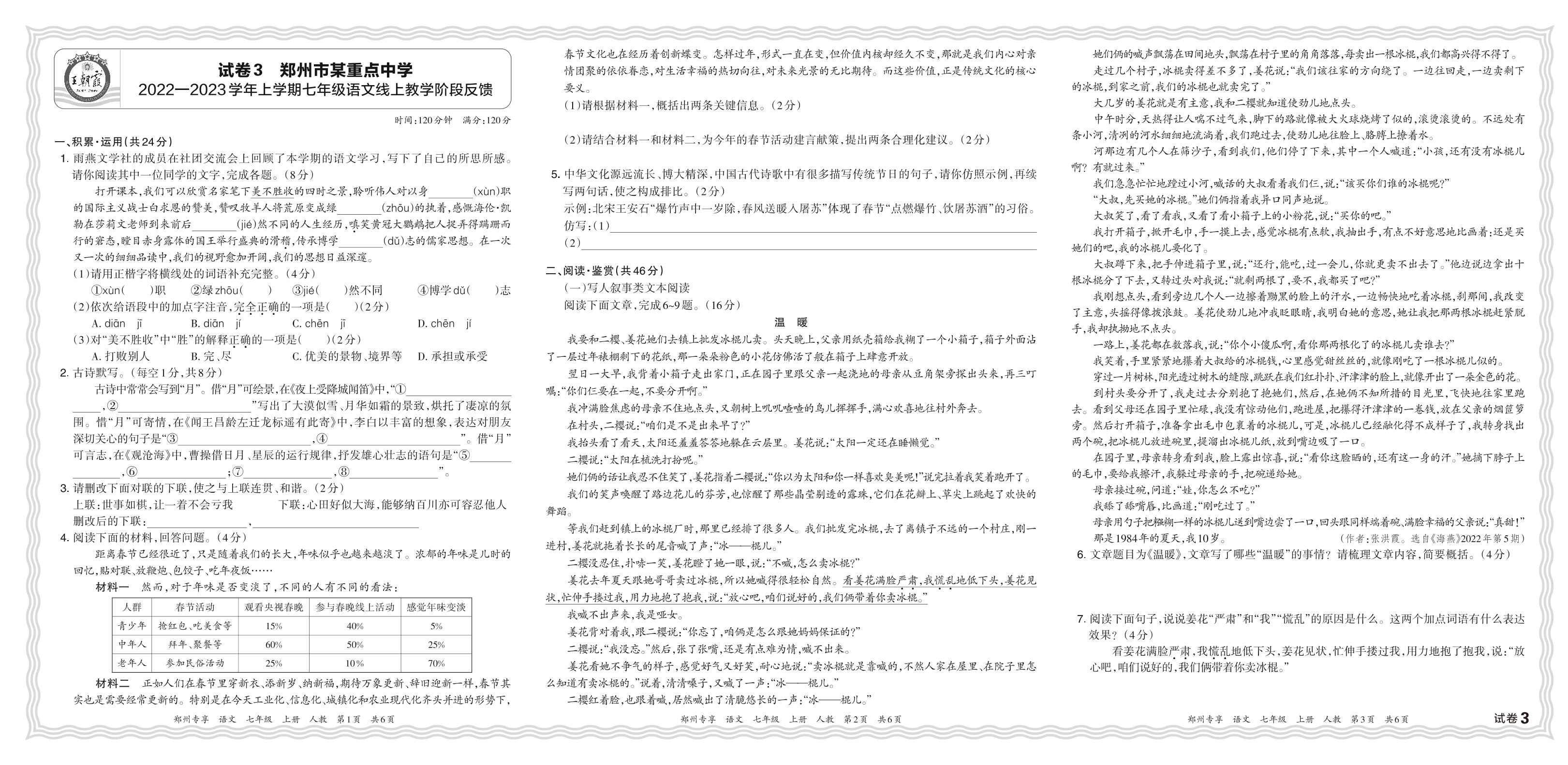 河南省郑州市某重点中学2022—2023学年上学期七年级语文线上教学阶段反馈(人教版)【3】