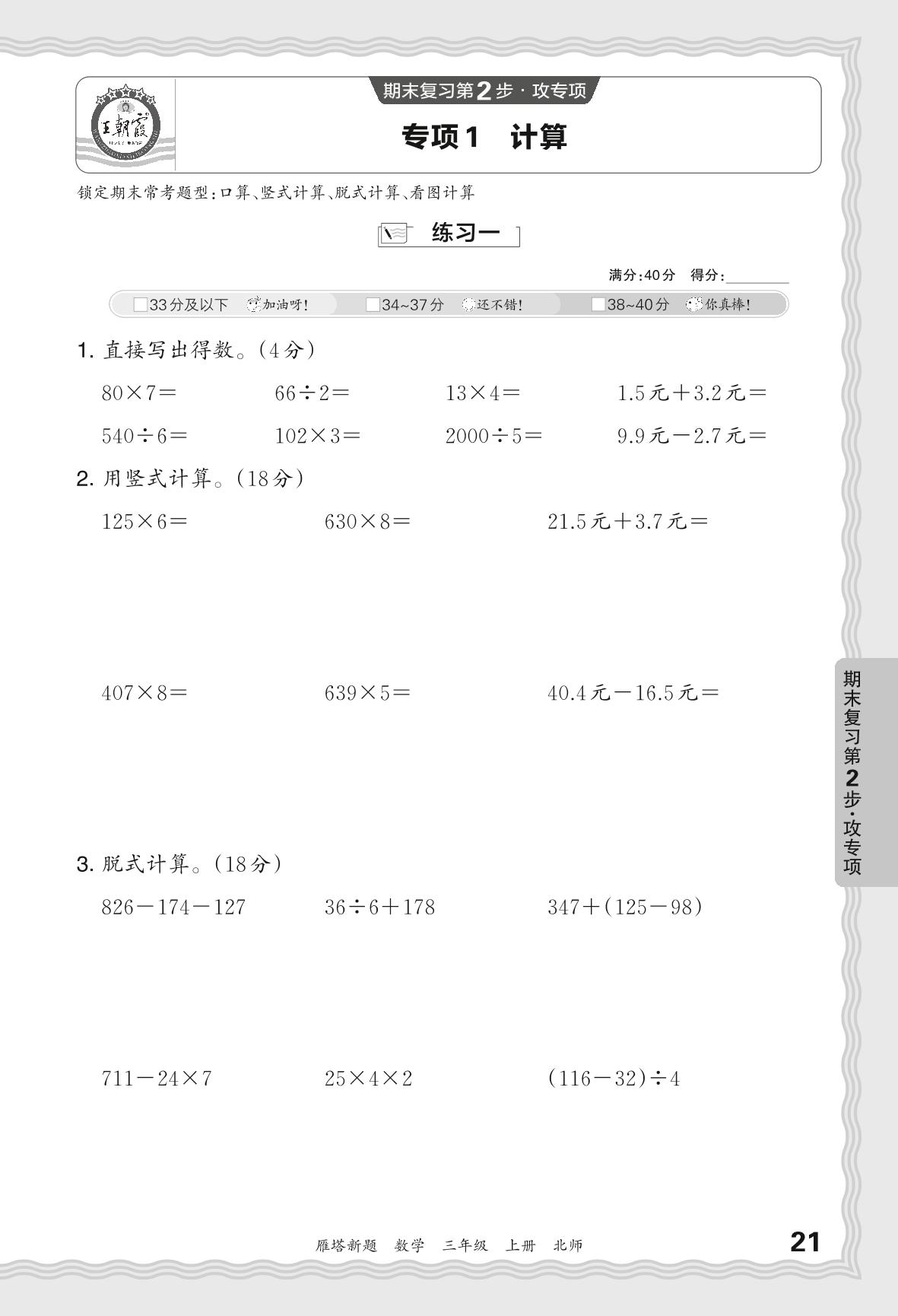 2023秋上册三年级数学北师版 期末专项·计算【1】