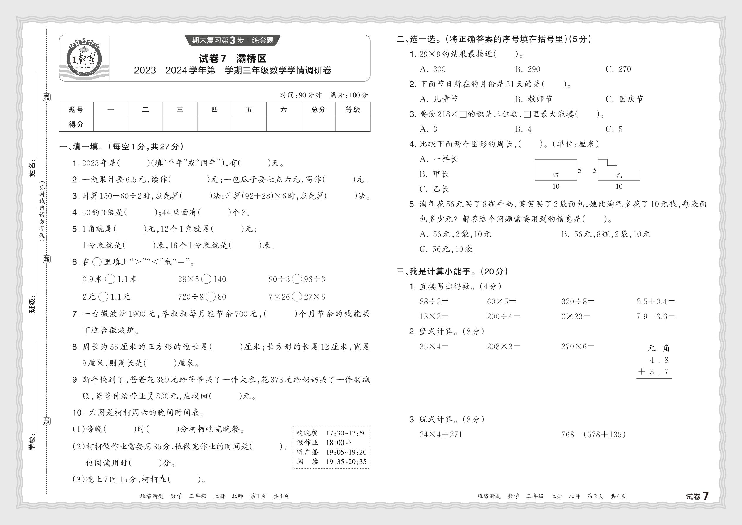 陕西省西安市灞桥区2023—2024学年第一学期三年级数学学情调研卷(北师版)【7】