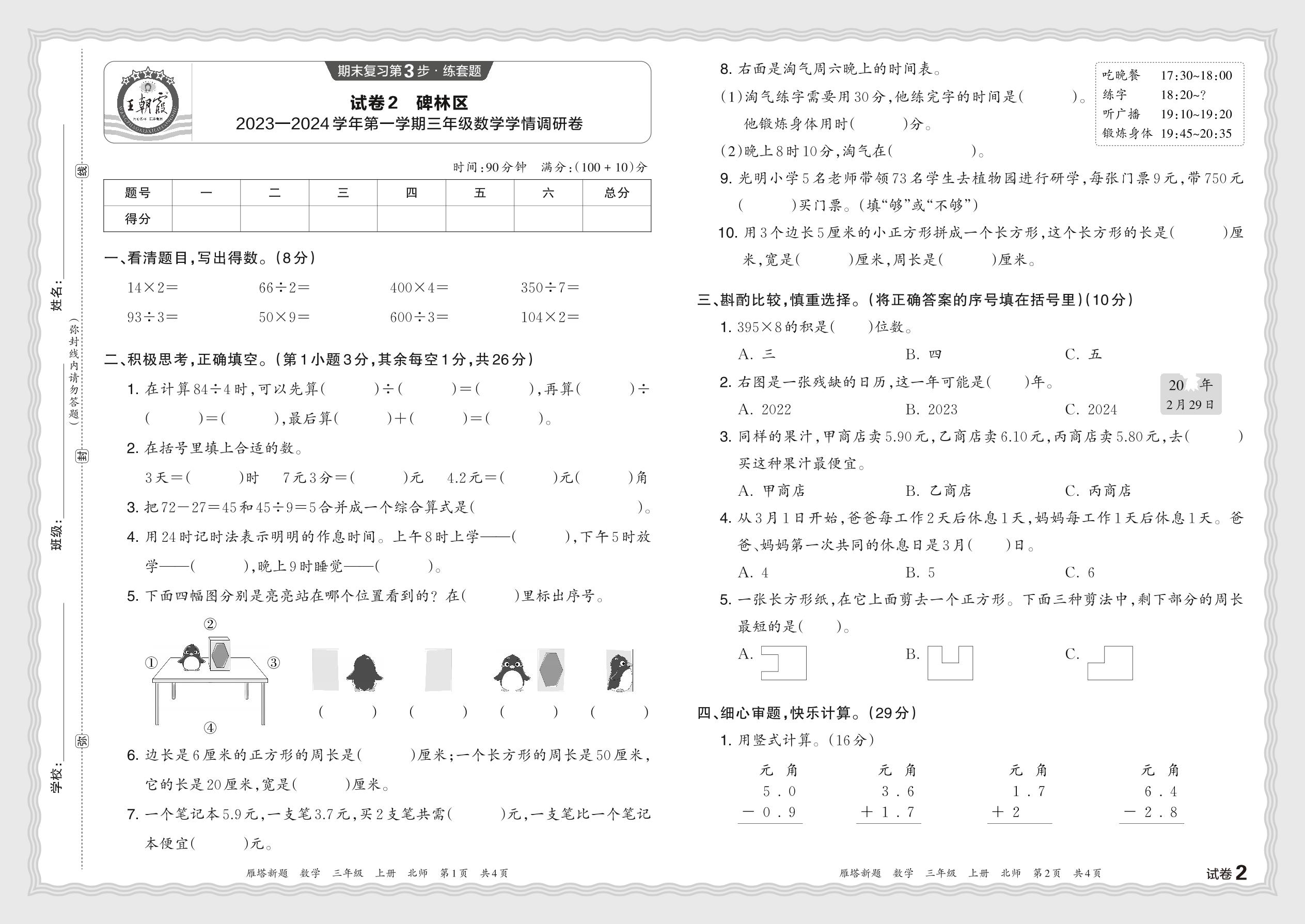 陕西省西安市碑林区2023—2024学年第一学期三年级数学学情调研卷(北师版)【2】