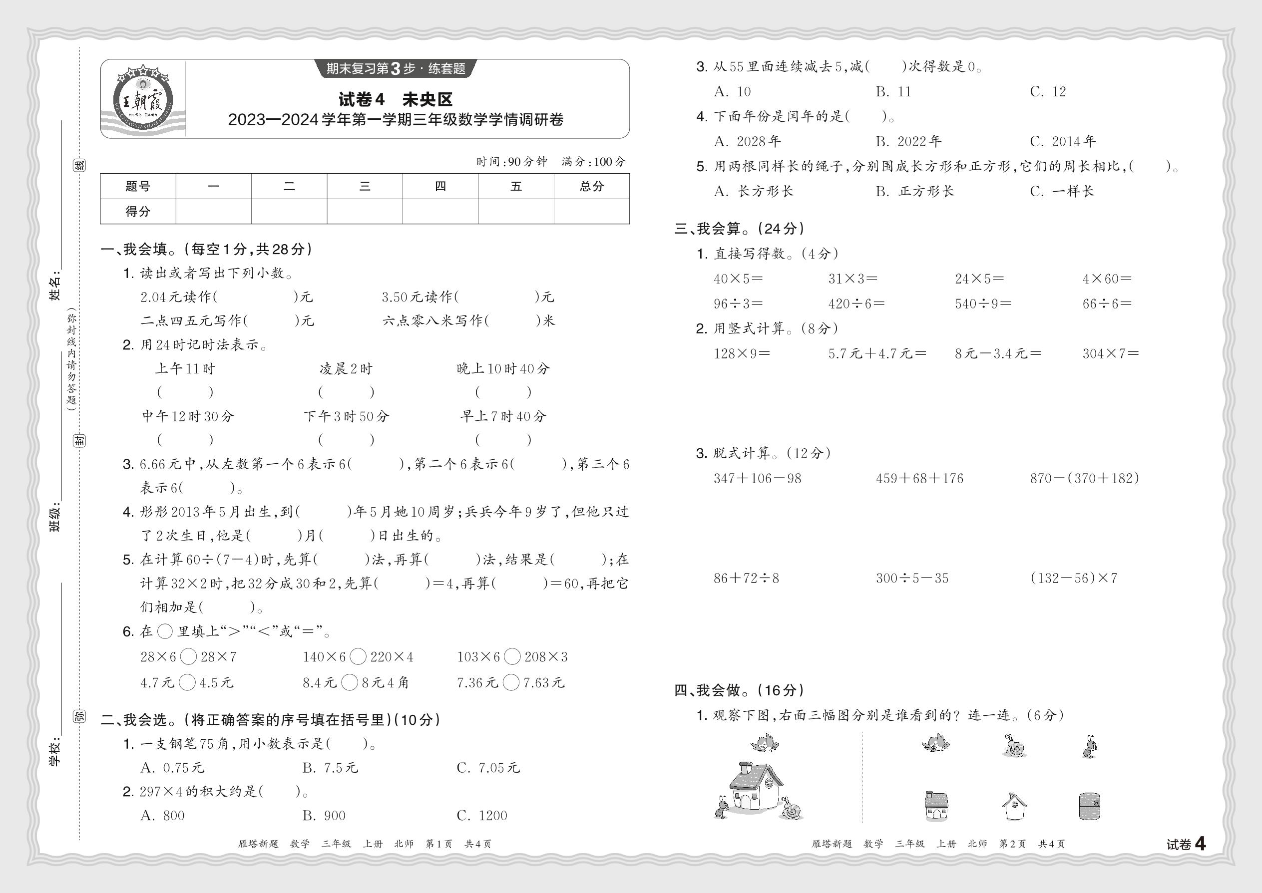 陕西省西安市未央区2023—2024学年第一学期三年级数学学情调研卷(北师版)【4】