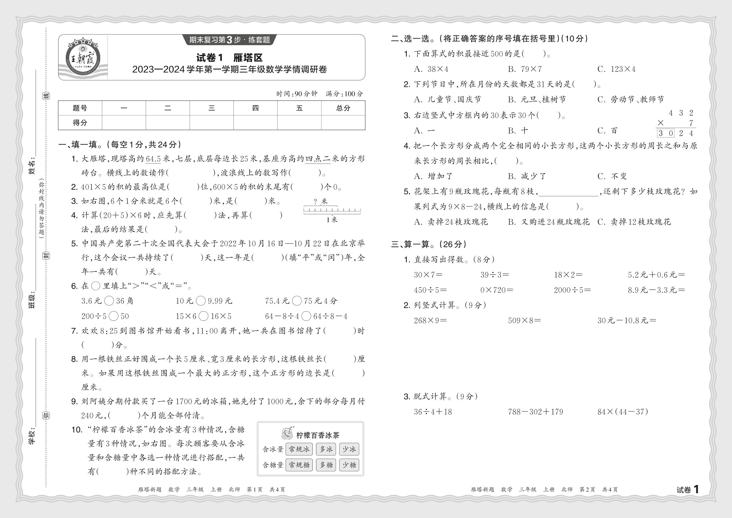 陕西省西安市雁塔区2023—2024学年第一学期三年级数学学情调研卷(北师版)【1】