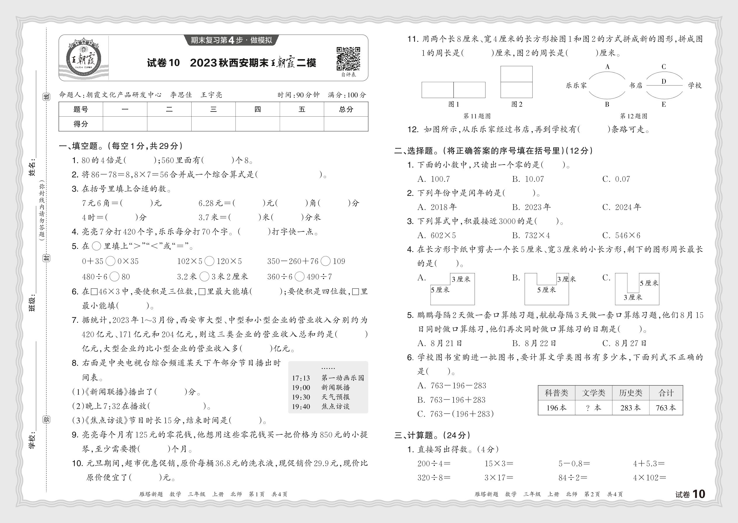 2023秋上册三年级数学北师版 陕西西安期末王朝霞二模