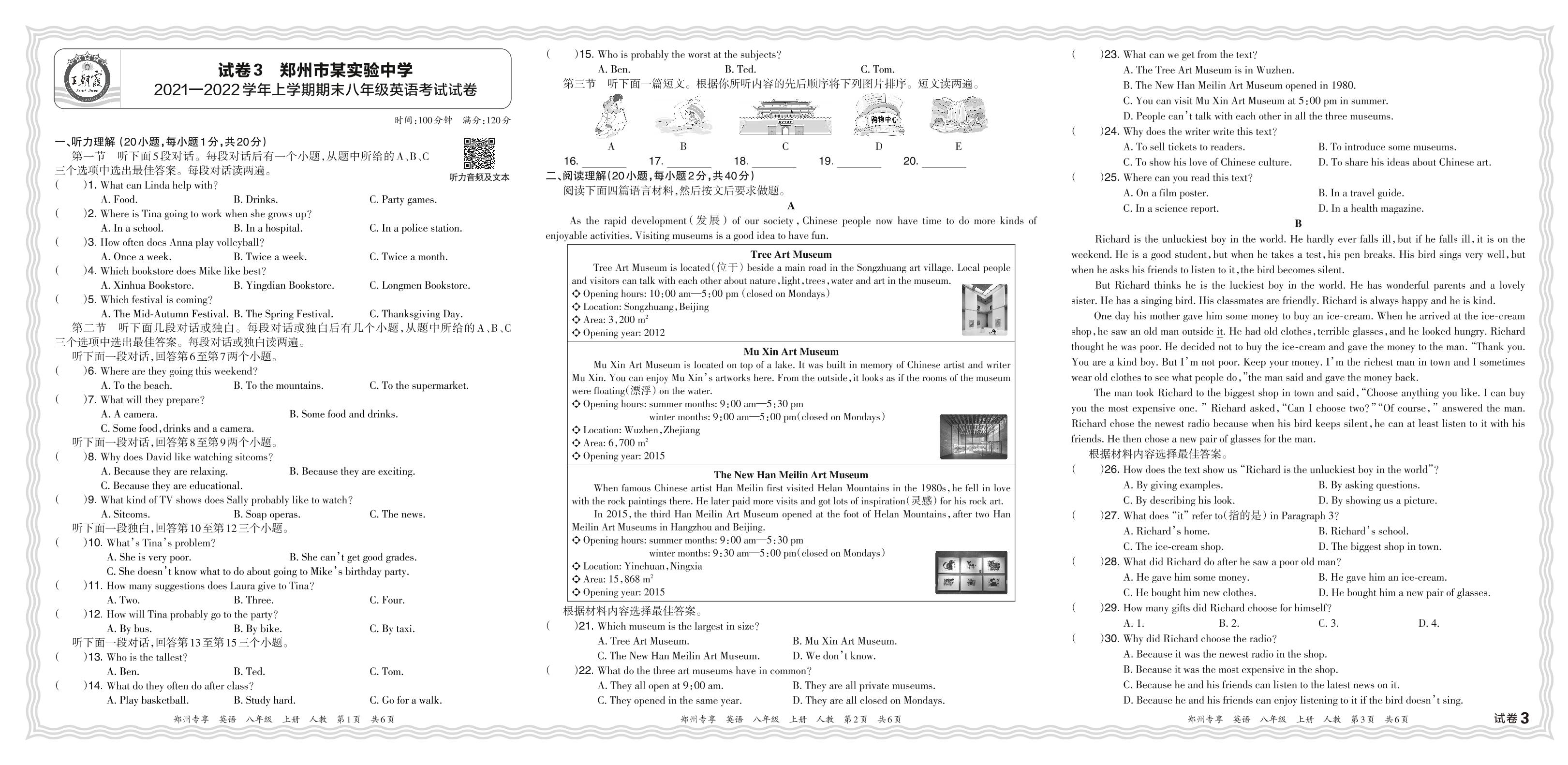 河南省郑州市某实验中学2021—2022学年上学期期末八年级英语考试试卷(人教版)【3】