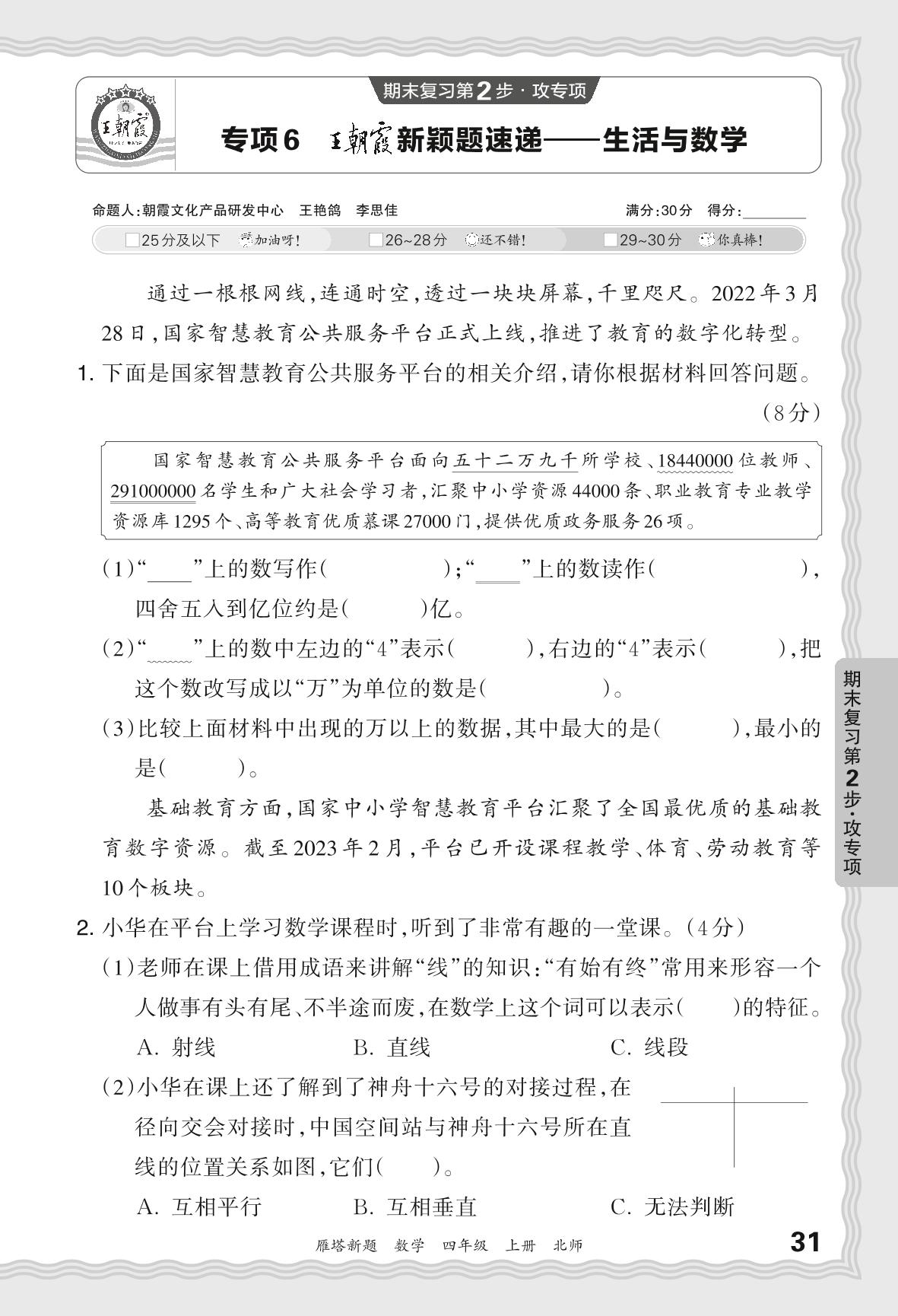 2023秋上册四年级数学北师版 期末专项·王朝霞新颖题速递——生活与数学【6】