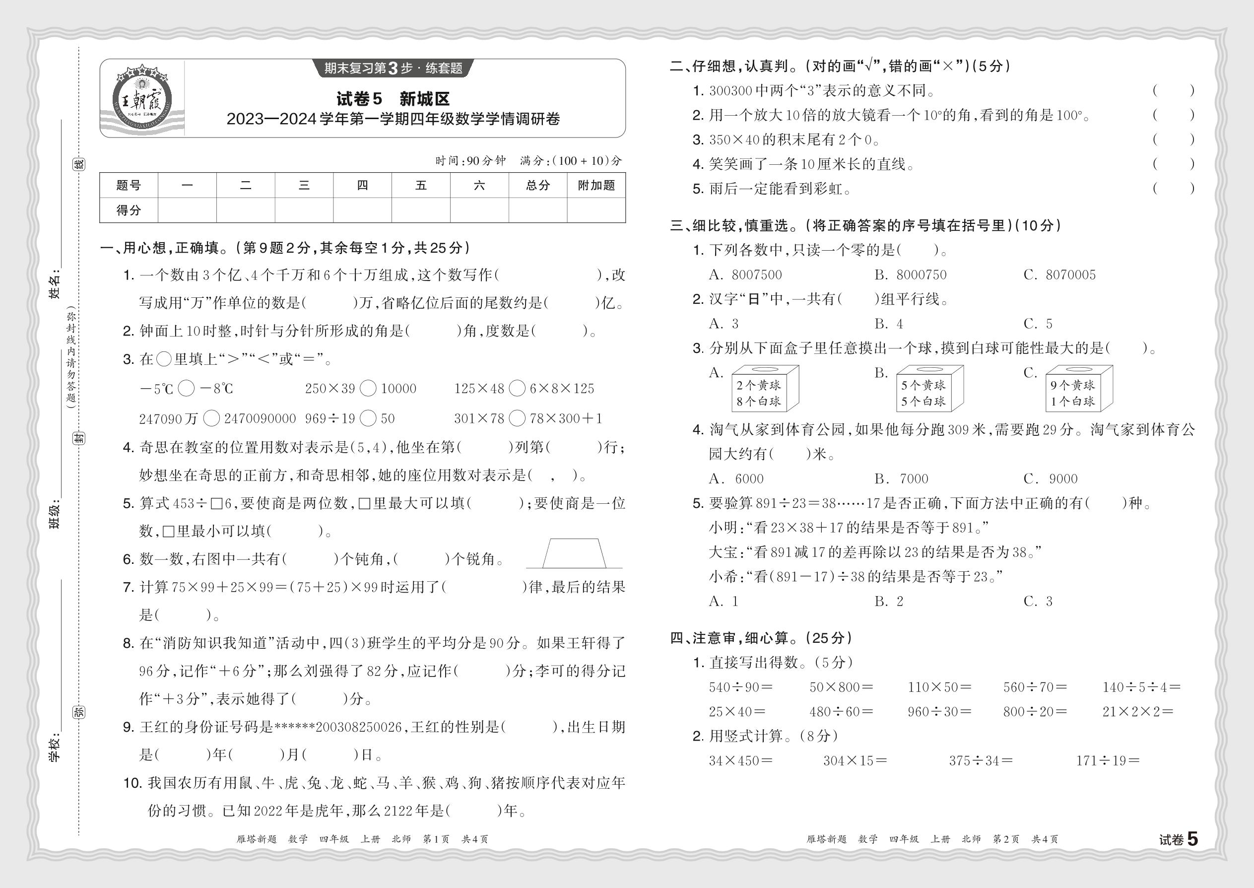 陕西省西安市新城区2023—2024学年第一学期四年级数学学情调研卷(北师版)【5】