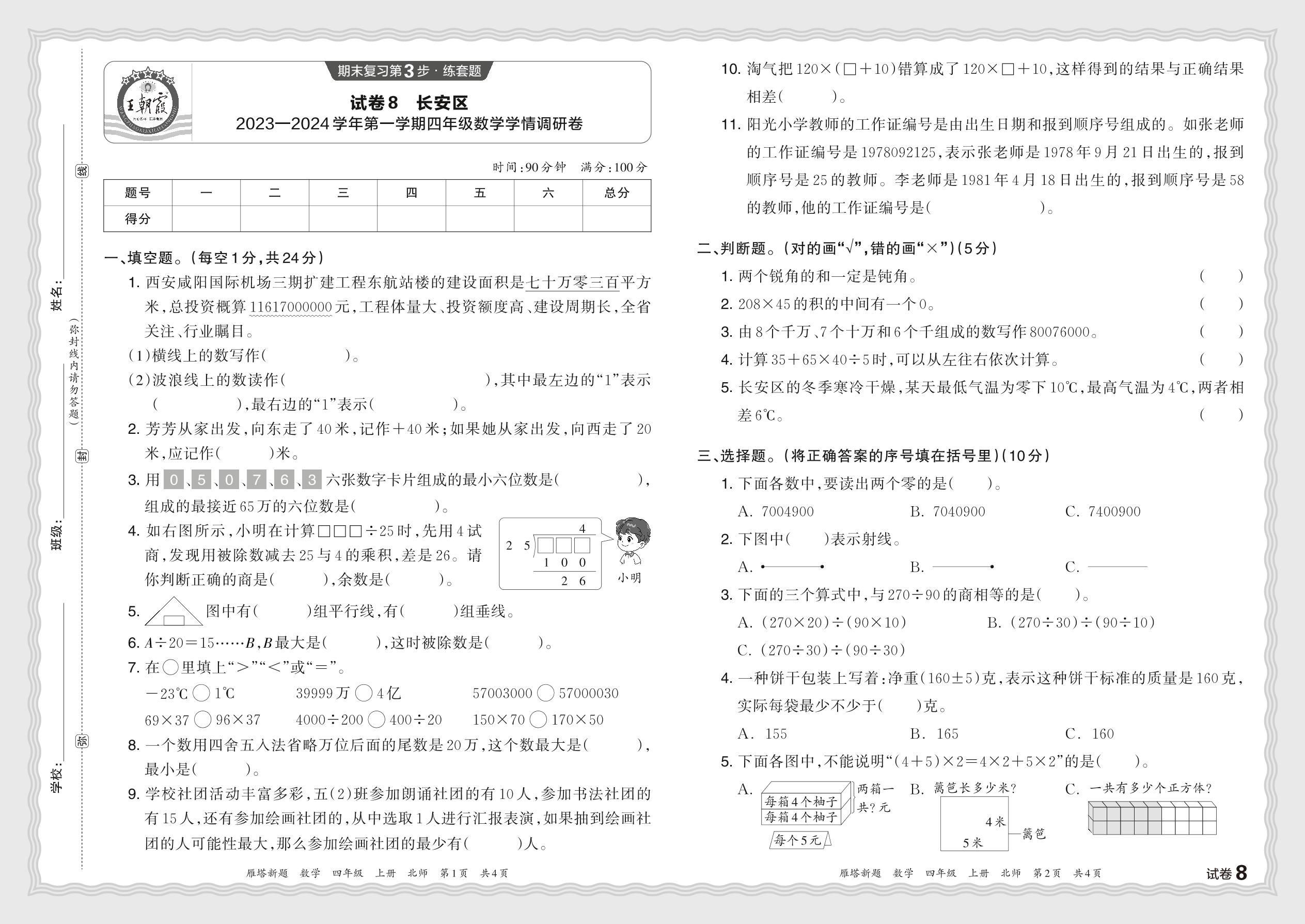 陕西省西安市长安区2023—2024学年第一学期四年级数学学情调研卷(北师版)【8】