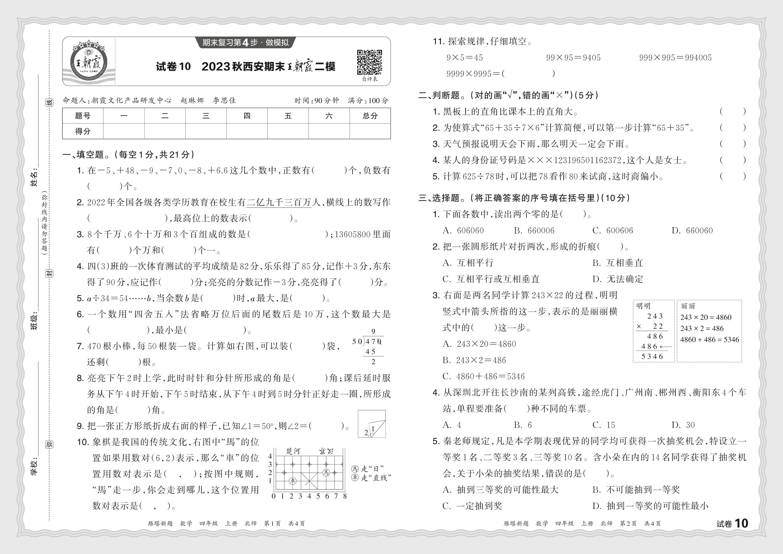 2023秋上册四年级数学北师版 陕西西安期末王朝霞二模