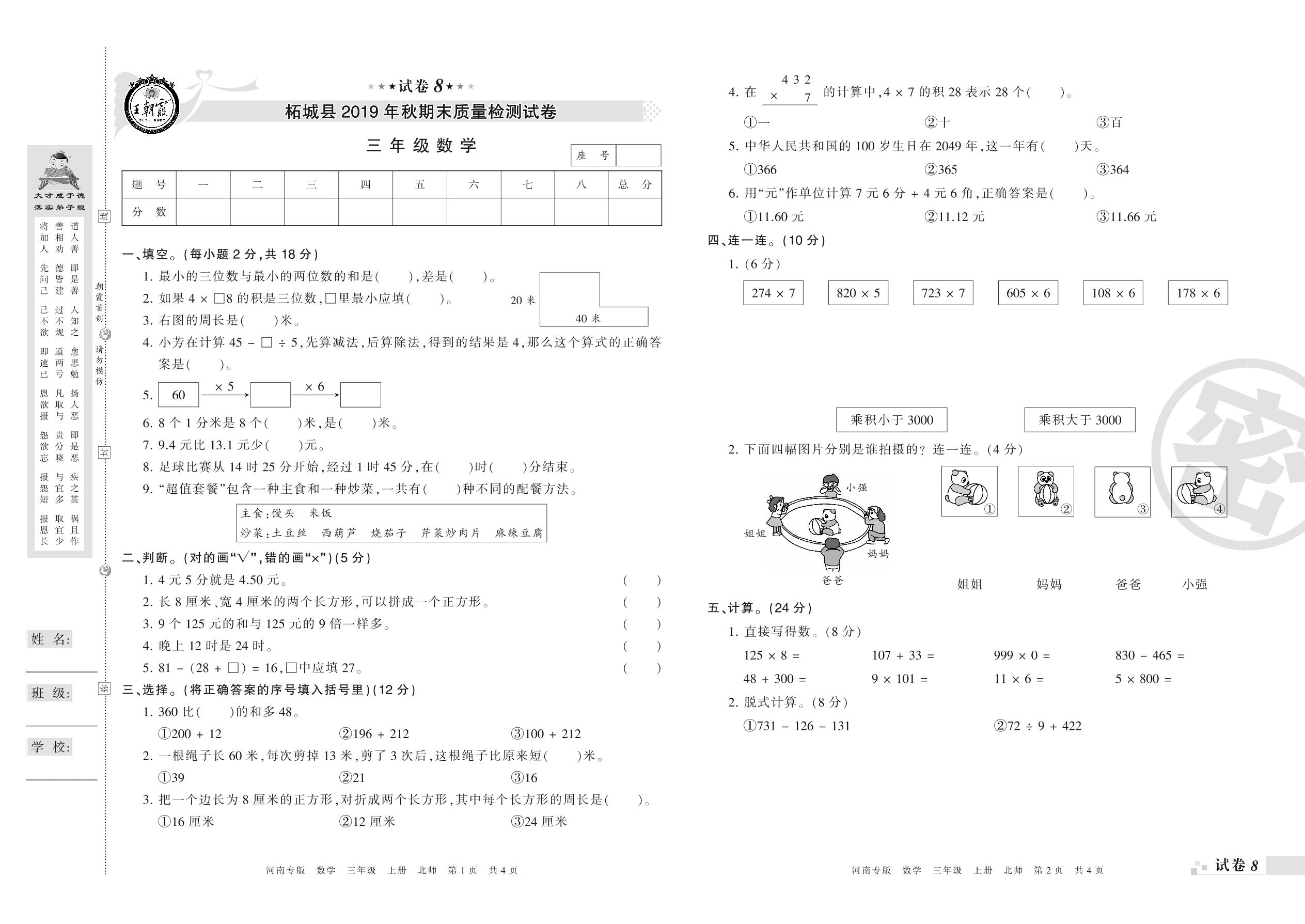 2019-2020学年第一学期商丘市柘城县三年级数学试卷(北师版)【8】