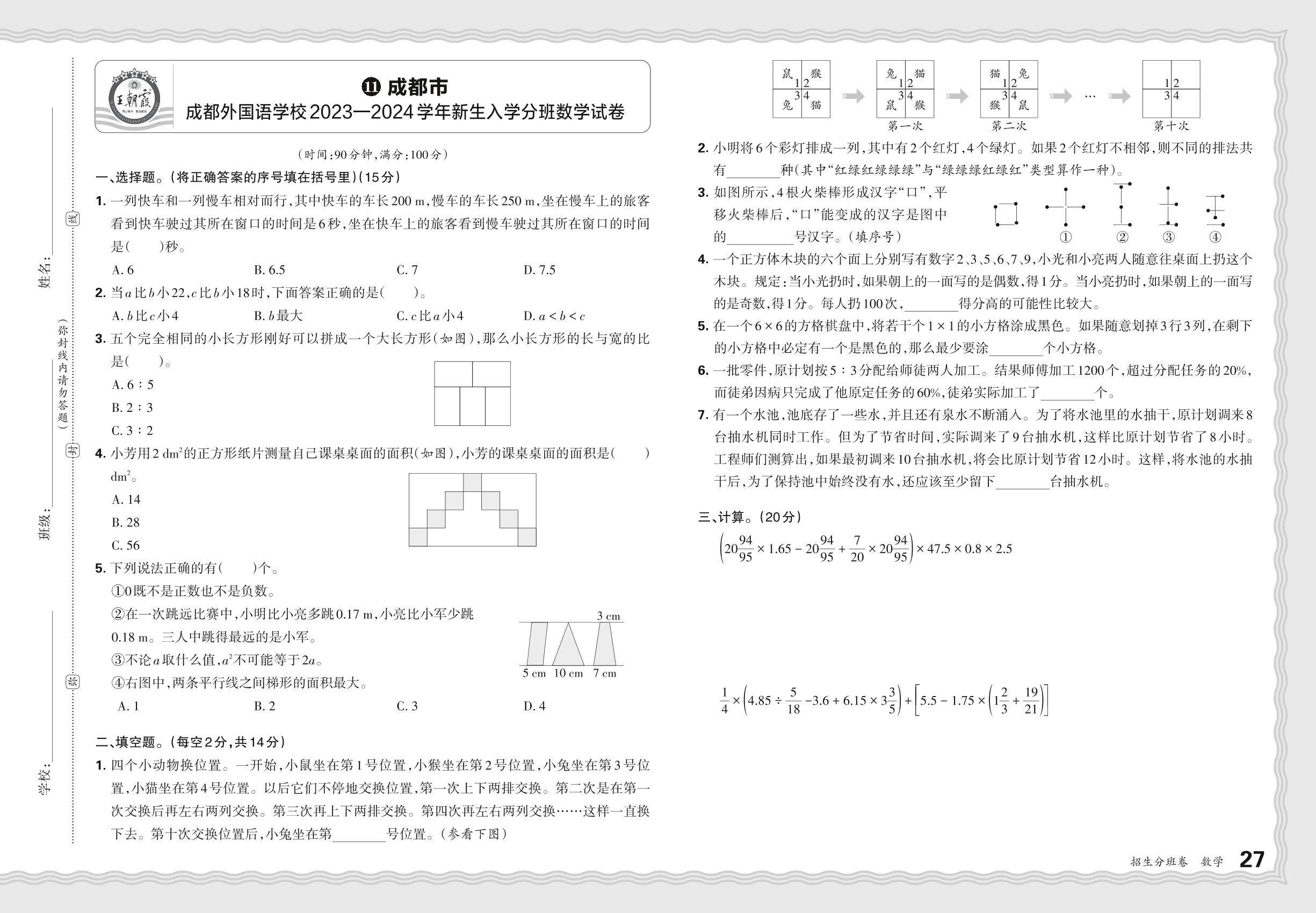 小升初·四川省成都市成都外国语学校2023—2024学年新生入学分班数学试卷【11】
