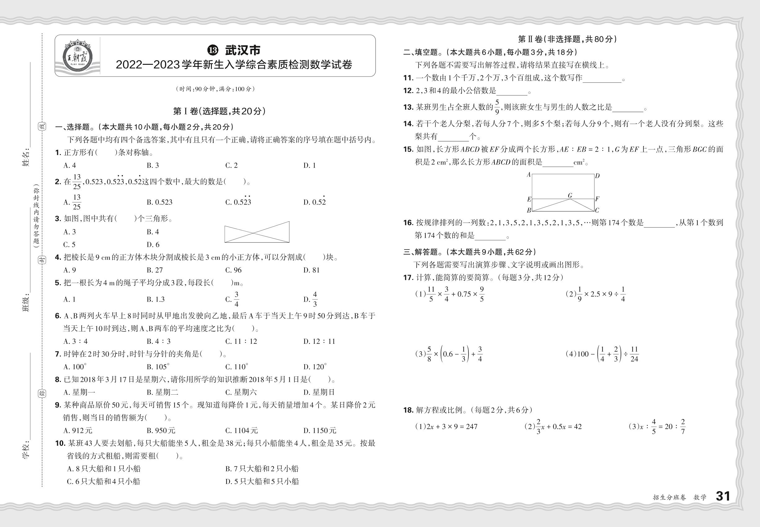 小升初·湖北省武汉市2022—2023学年新生入学综合素质检测数学试卷【13】