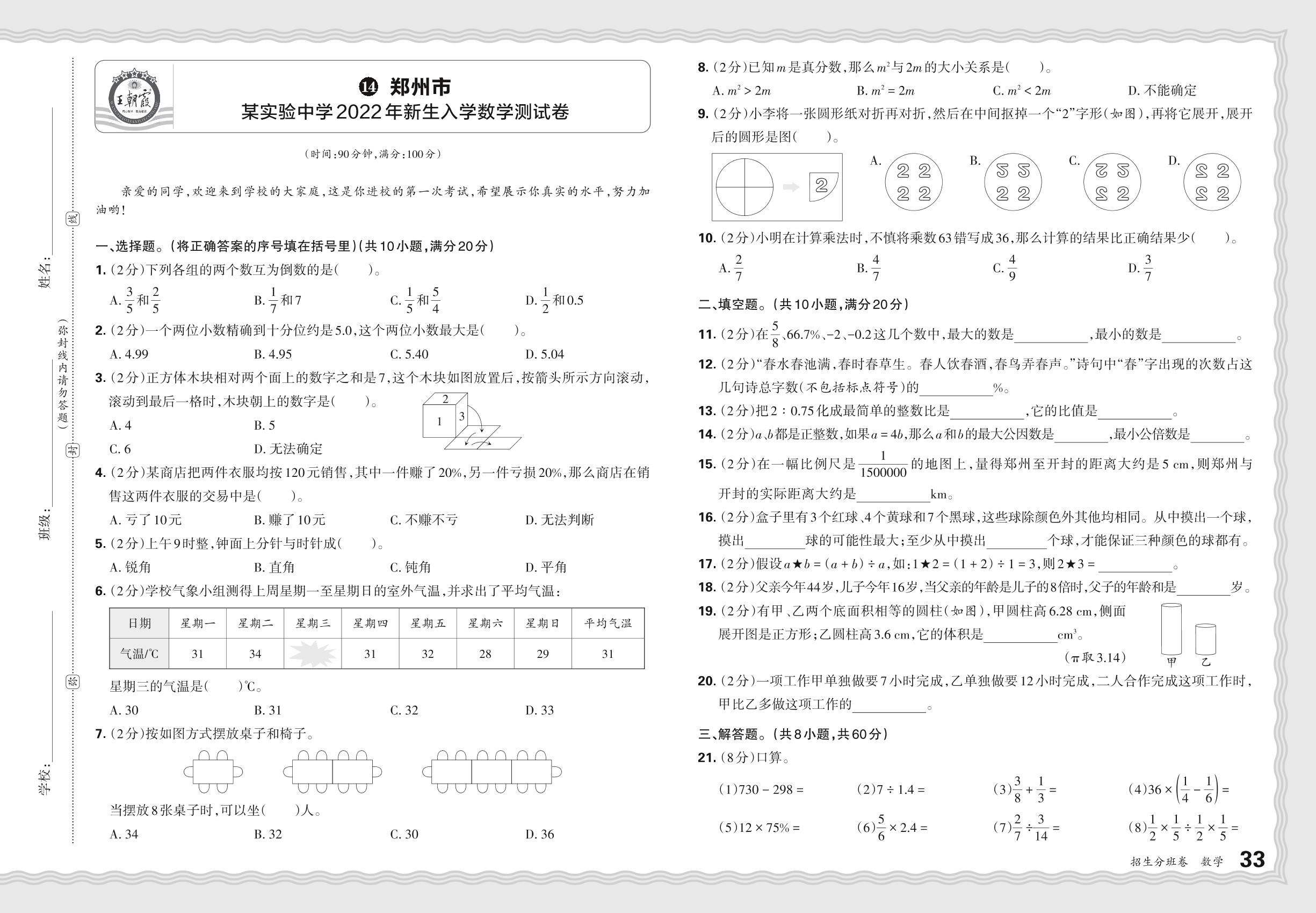 小升初·河南省郑州市某实验中学2022年新生入学数学测试卷 【14】