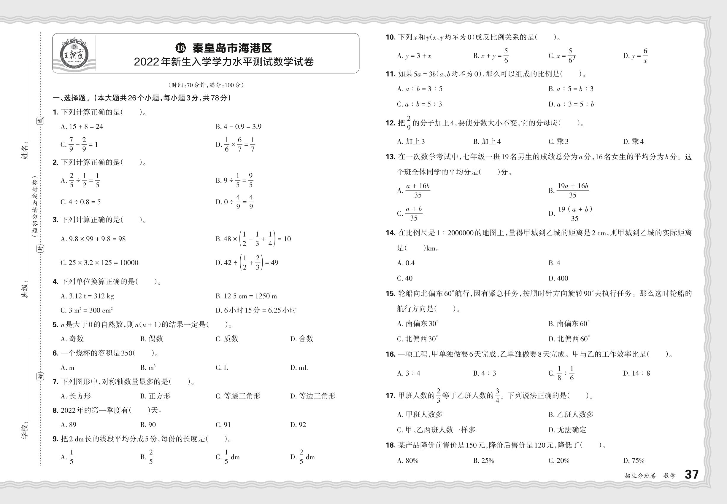 小升初·河北省秦皇岛市海港区2022年新生入学学力水平测试数学试卷【16】