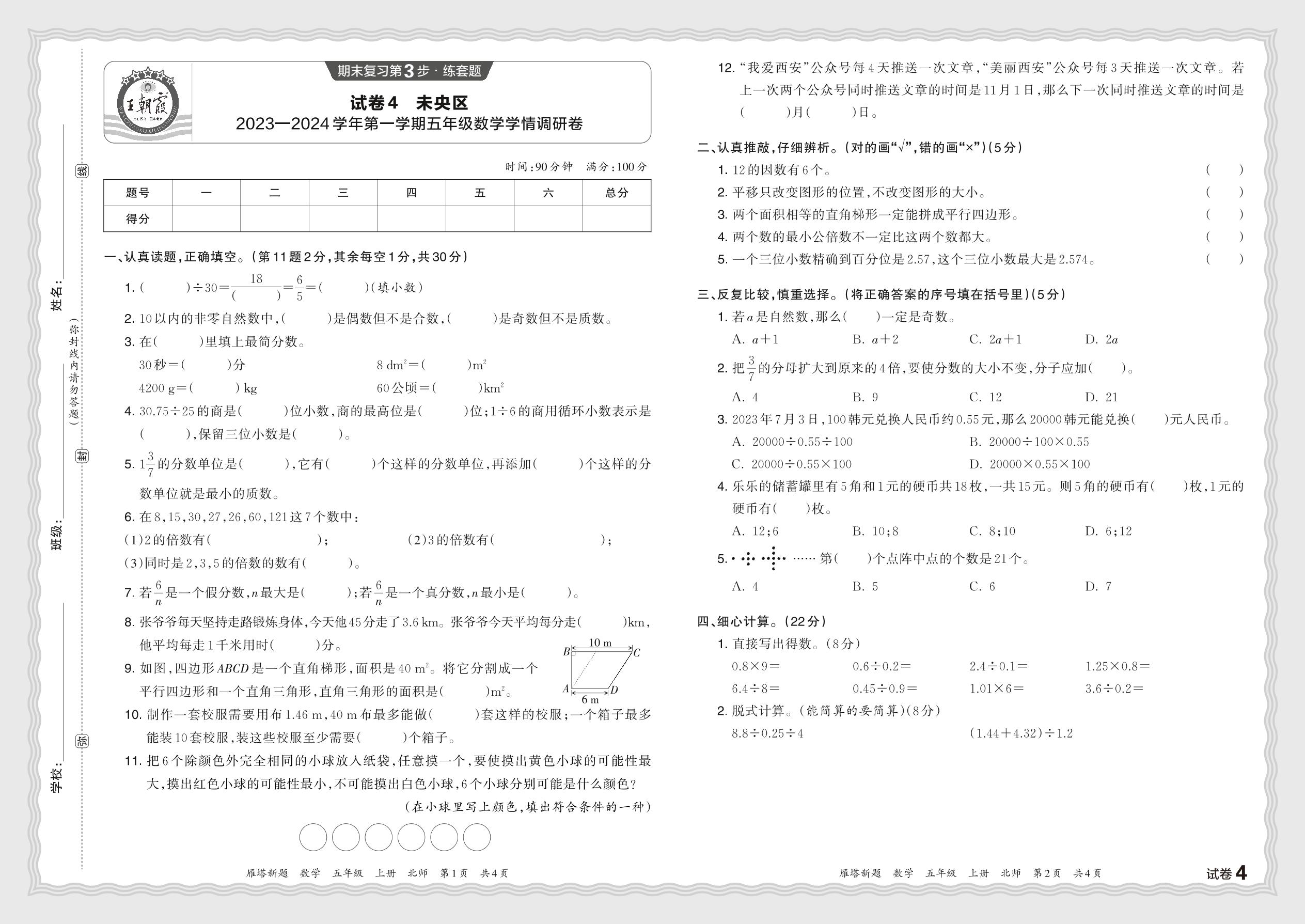 陕西省西安市未央区2023—2024学年第一学期五年级数学学情调研卷(北师版)【4】