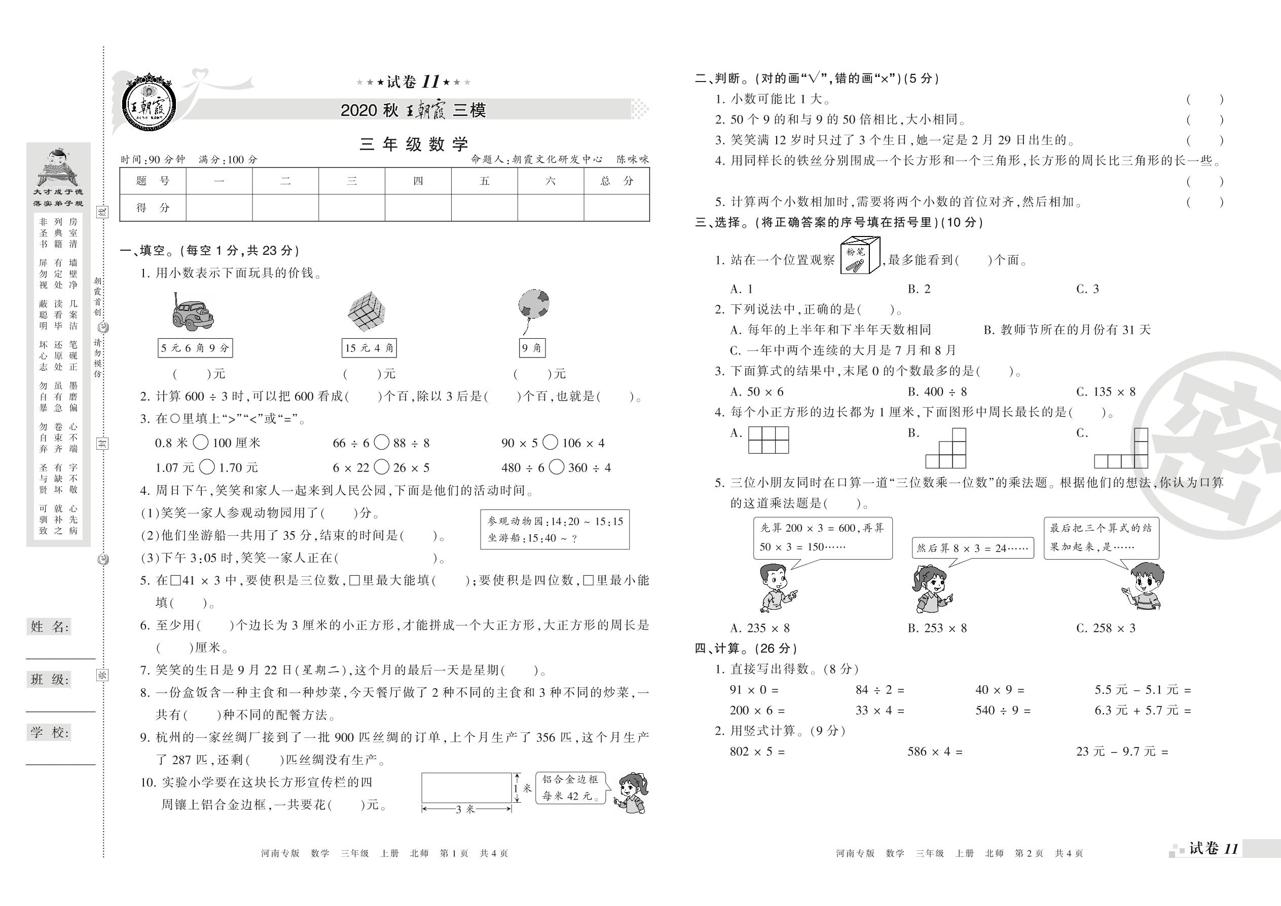 王朝霞期末模拟卷三年级上册数学(北师版)_R21080491311【11】