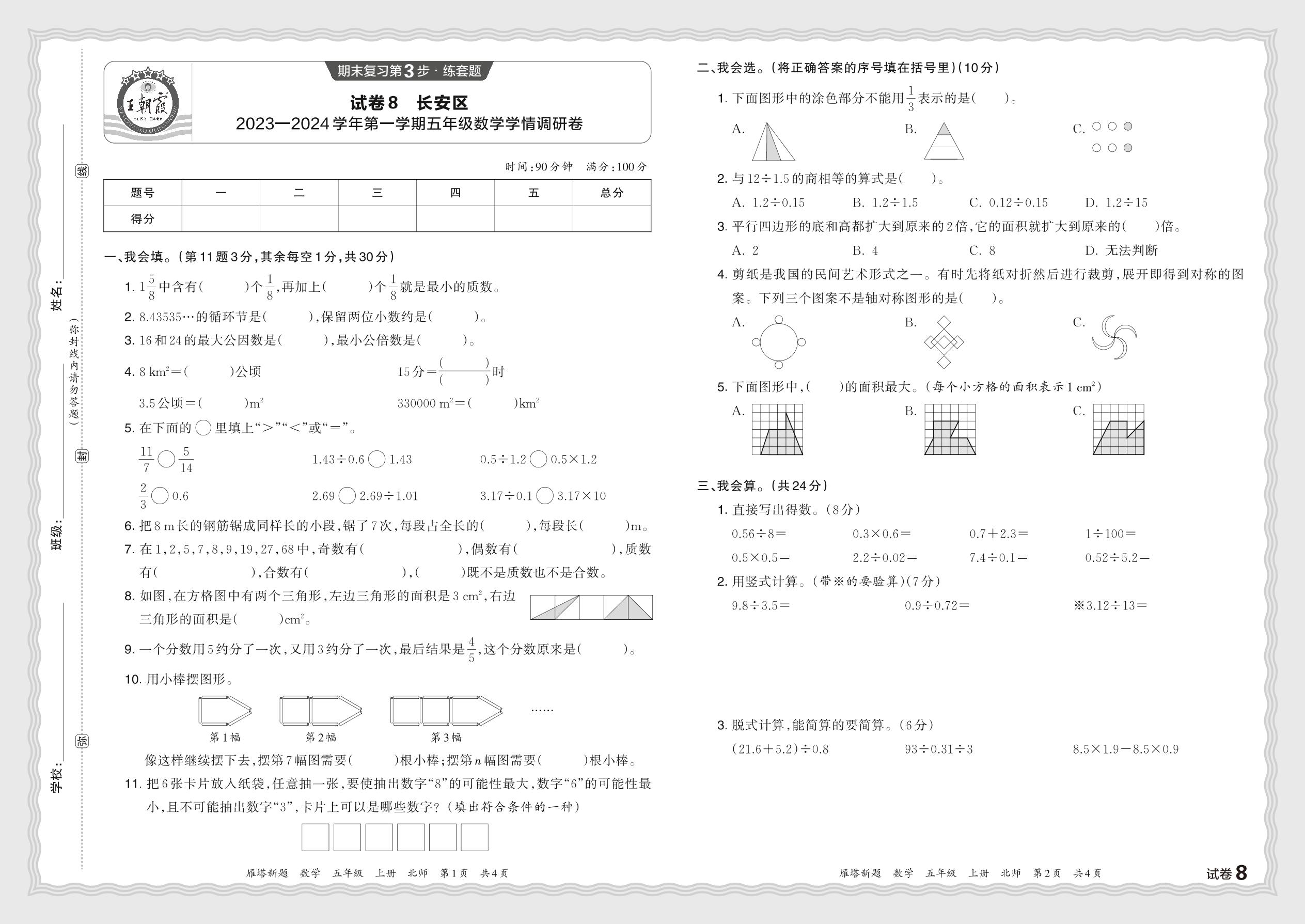 陕西省西安市长安区2023—2024学年第一学期五年级数学学情调研卷(北师版)【8】