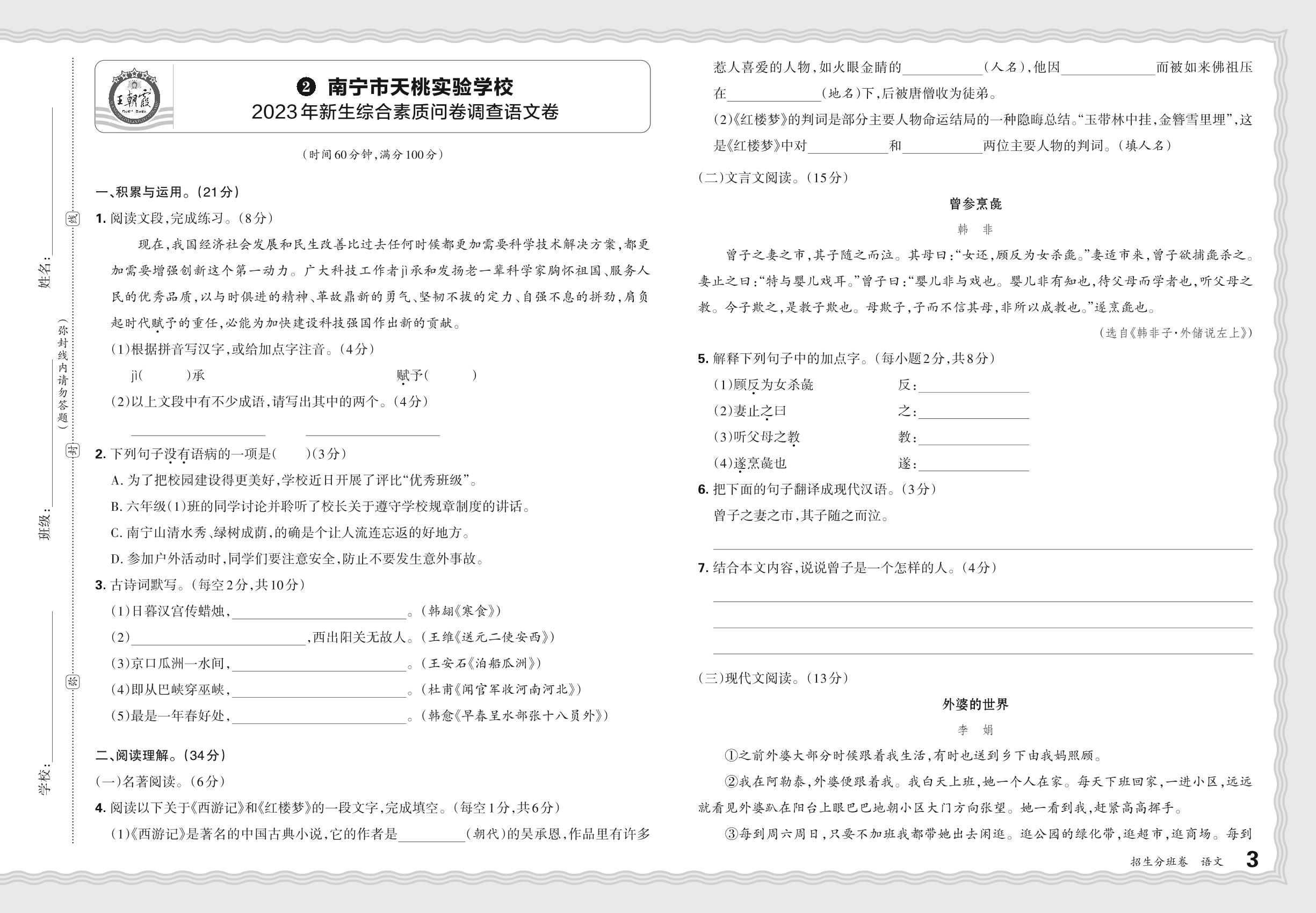 小升初·广西省南宁市天桃实验学校2023年新生综合素质问卷调查语文卷【2】