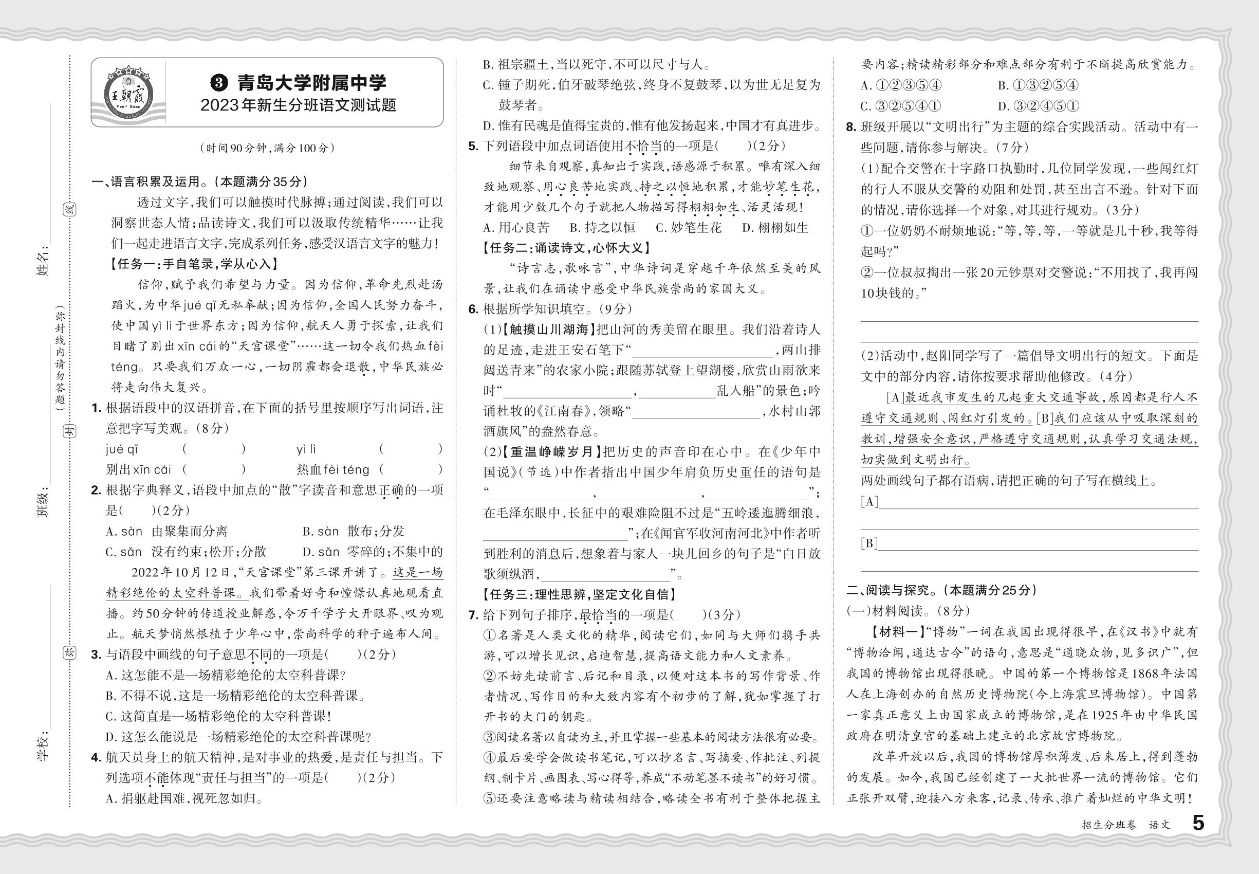 小升初·山东省青岛大学附属中学2023年新生分班语文測试题【4】