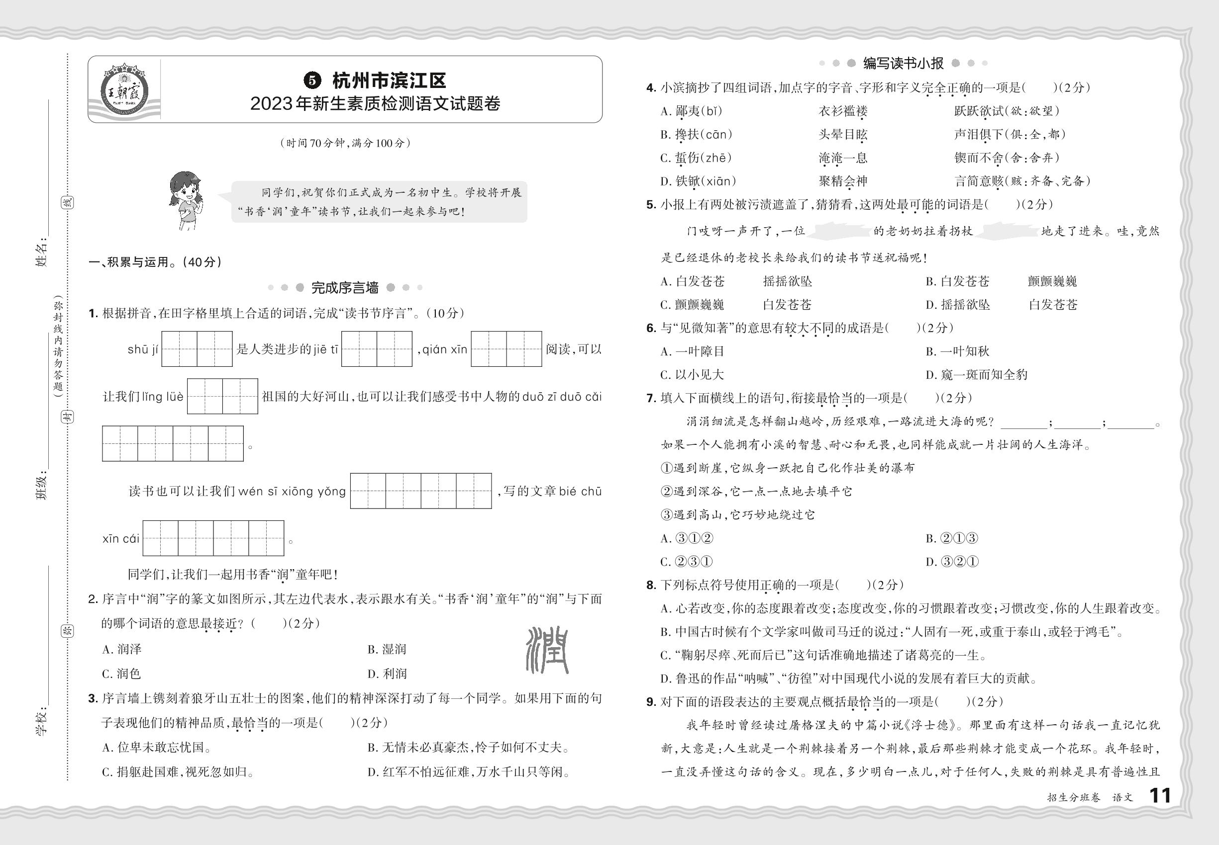 小升初·浙江省杭州市滨江区2023年新生素质检测语文试题卷【5】
