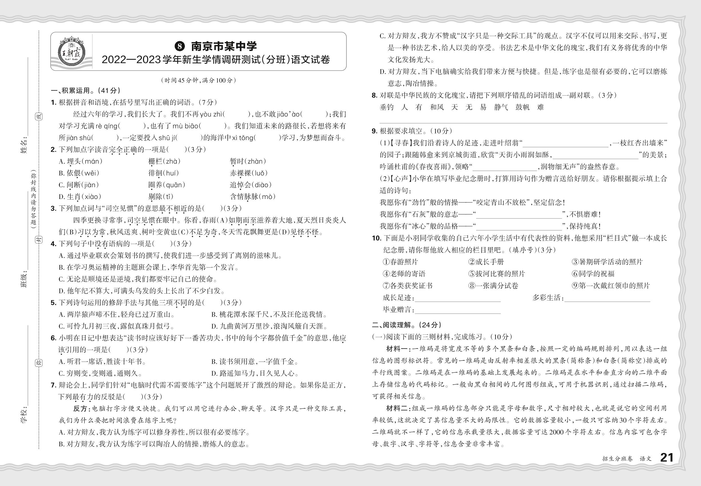 小升初·江苏省南京市某中学2022—2023学年新生学情调研测试(分班)语文试卷【8】