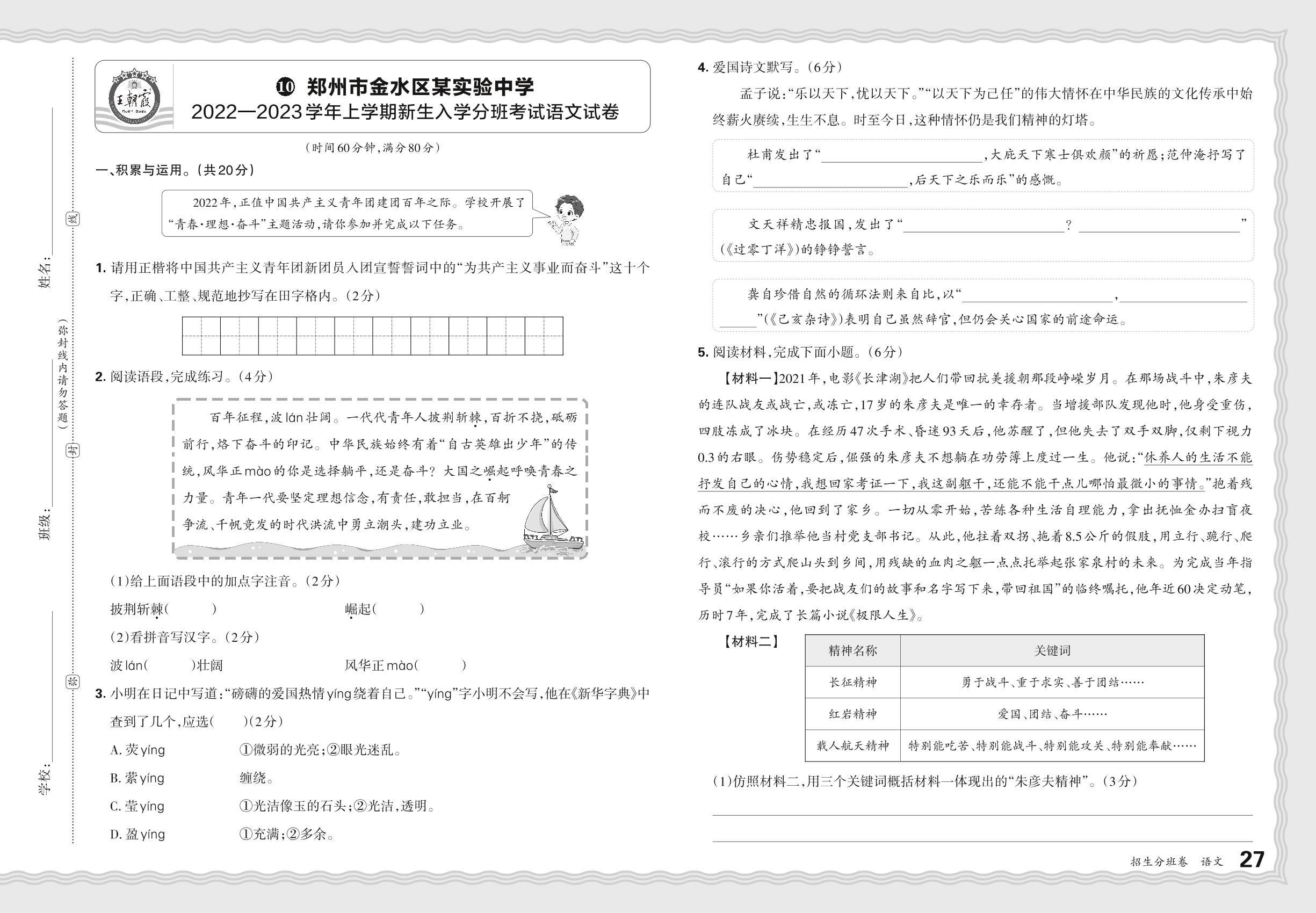 小升初·河南省郑州市金水区某实验中学2022—2023学年上学期新生入学分班考试语文试卷【10】
