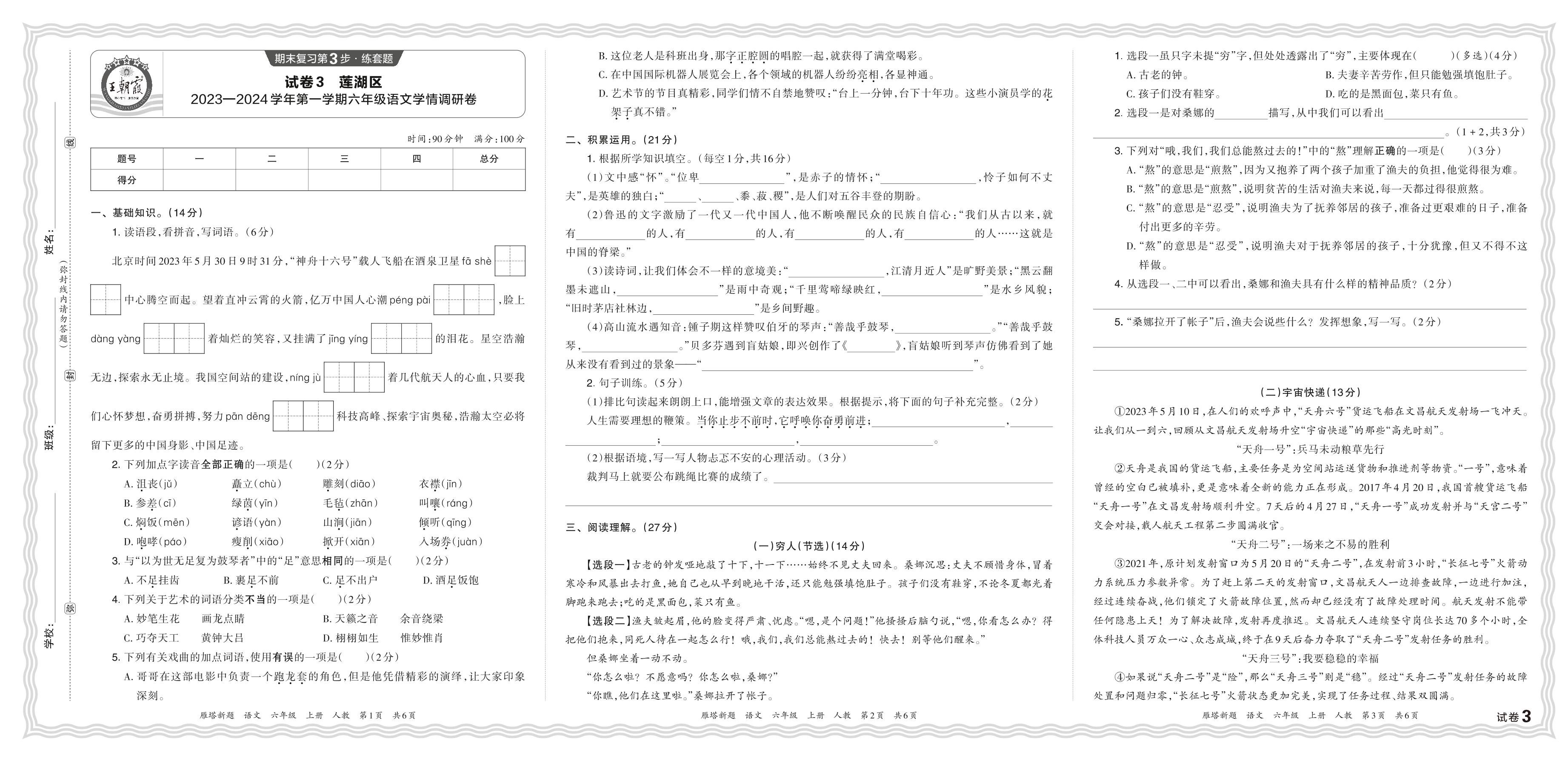 陕西省西安市莲湖区2023—2024学年第一学期六年级语文学情调研卷(人教版)【3】