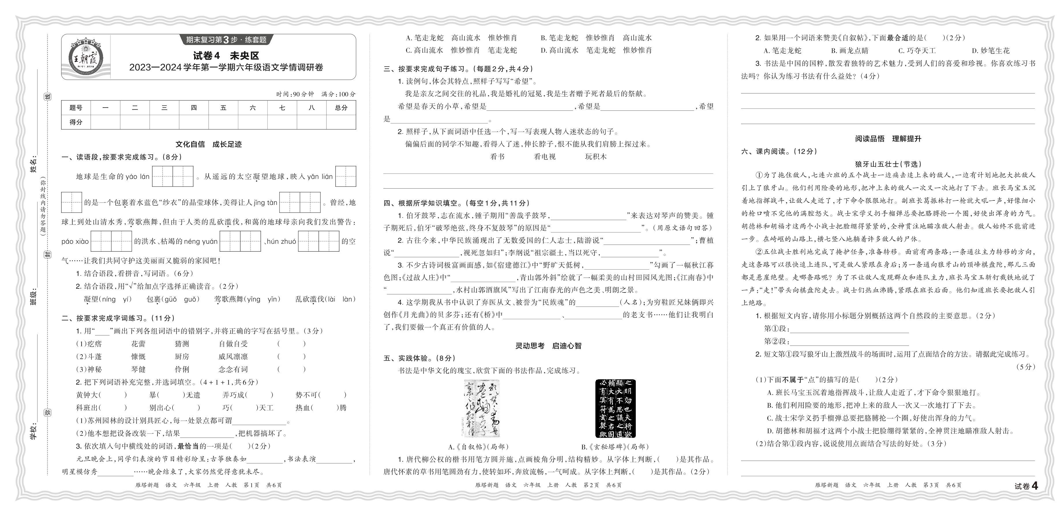 陕西省西安市未央区2023—2024学年第一学期六年级语文学情调研卷(人教版)【4】
